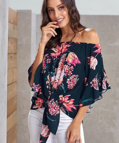 Blue Bohemian Print Embroidered V Neckline Detail Long Sleeve Shirt