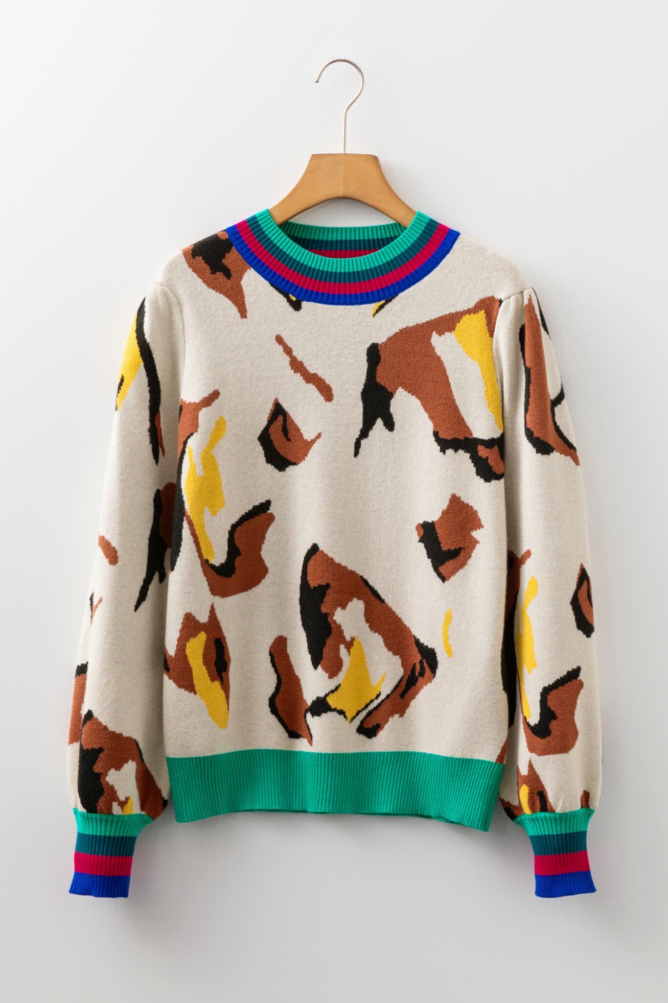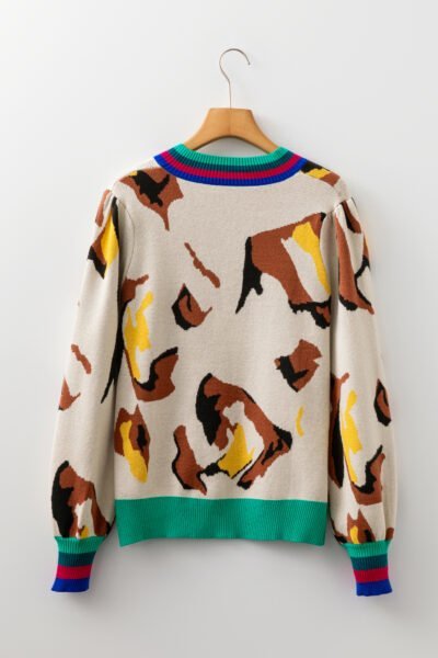 Apricot Contrast Ribbed Stripes Detail Animal Pattern Knit Sweater
