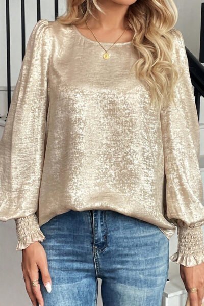 Apricot Metallic Round Neck Smocked Long Sleeve Blouse
