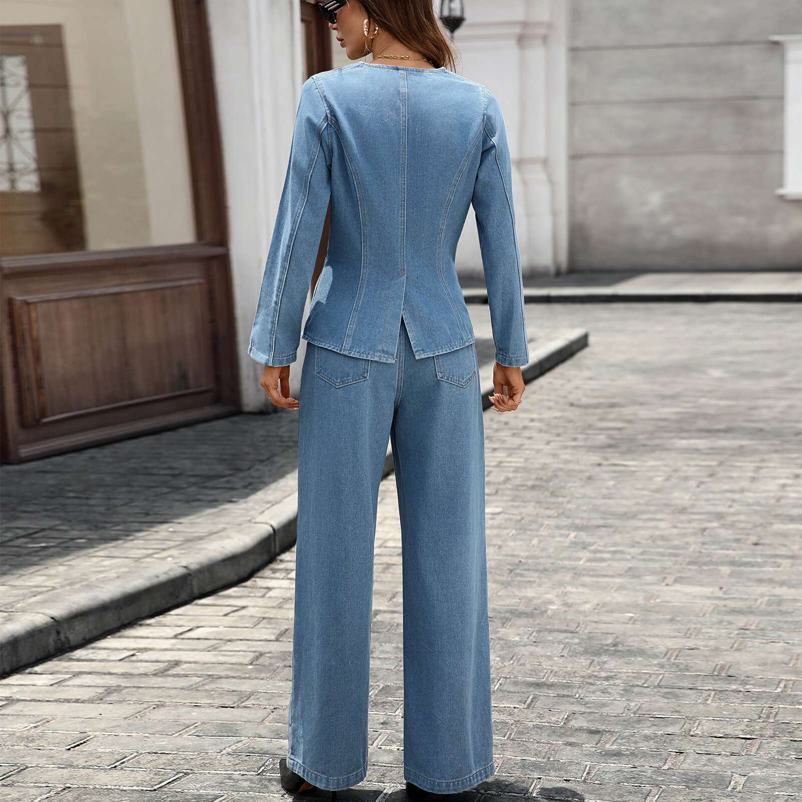 Beau Blue New-In Washed Denim Long Sleeve Top & Pants Set