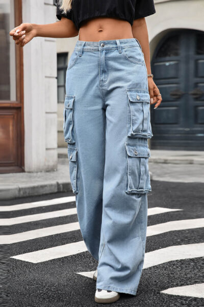 Beau Blue Utility Multi Pocket Straight Wide Leg Denim Cargo Pants