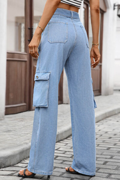 Beau Blue Washed Denim Cargo Pants with Multi Pockets and Long Belt