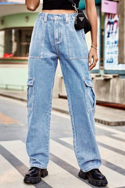 Beau Blue Washed Semi-Elastic Waist Denim Cargo Casual Pants