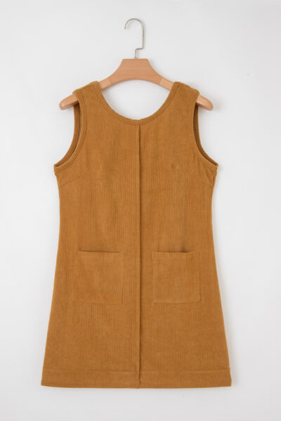 Beige Corduroy Sleeveless Mini Dress With Patched Pockets
