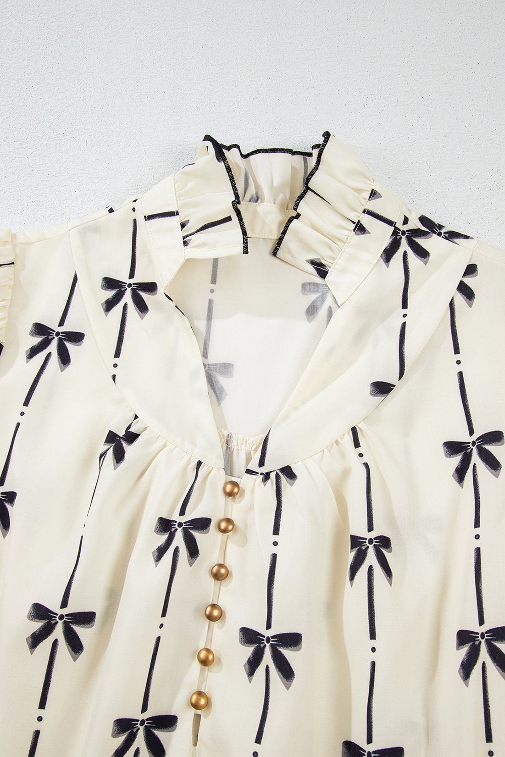 Beige Cute Bowknot Printed Bubble Sleeve V Neck Mini Dress
