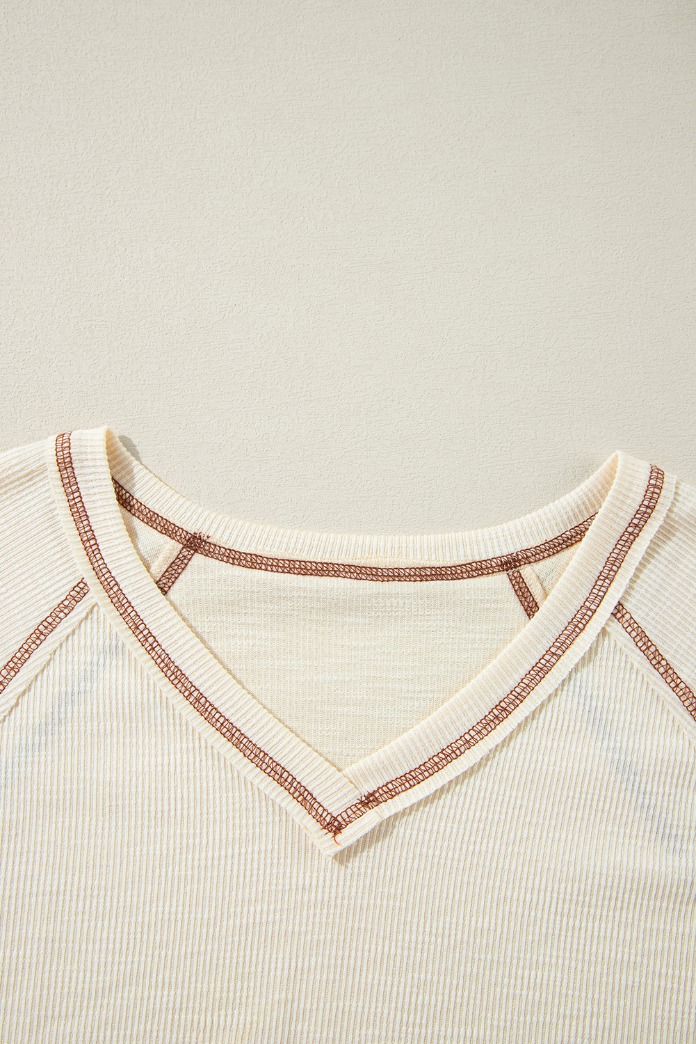 Beige Exposed Seam Textured Knit V Neck Pullover Top