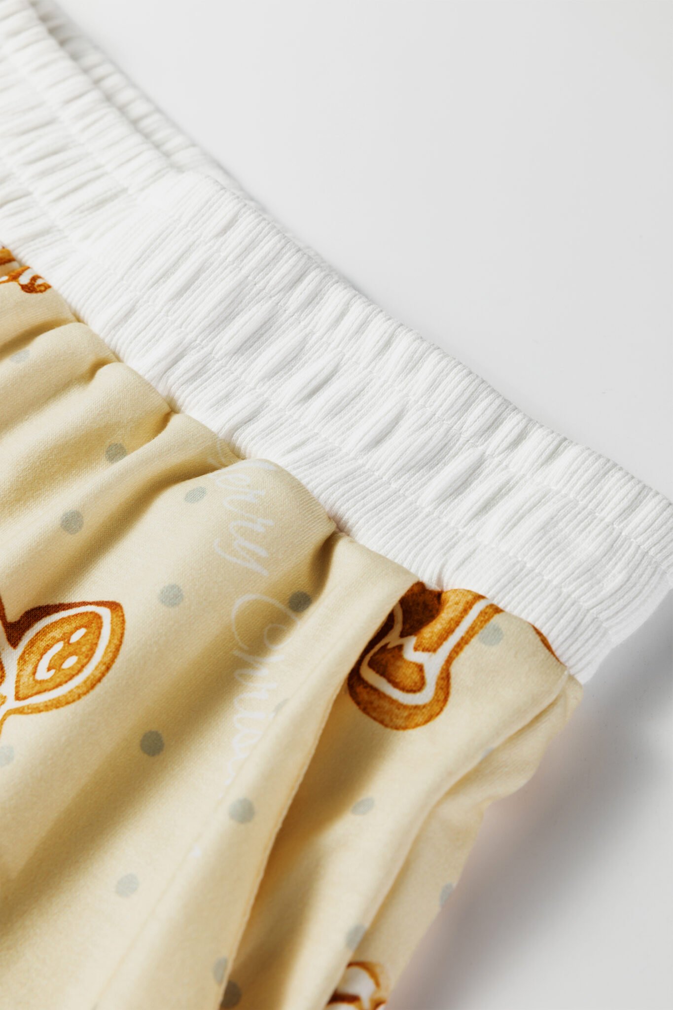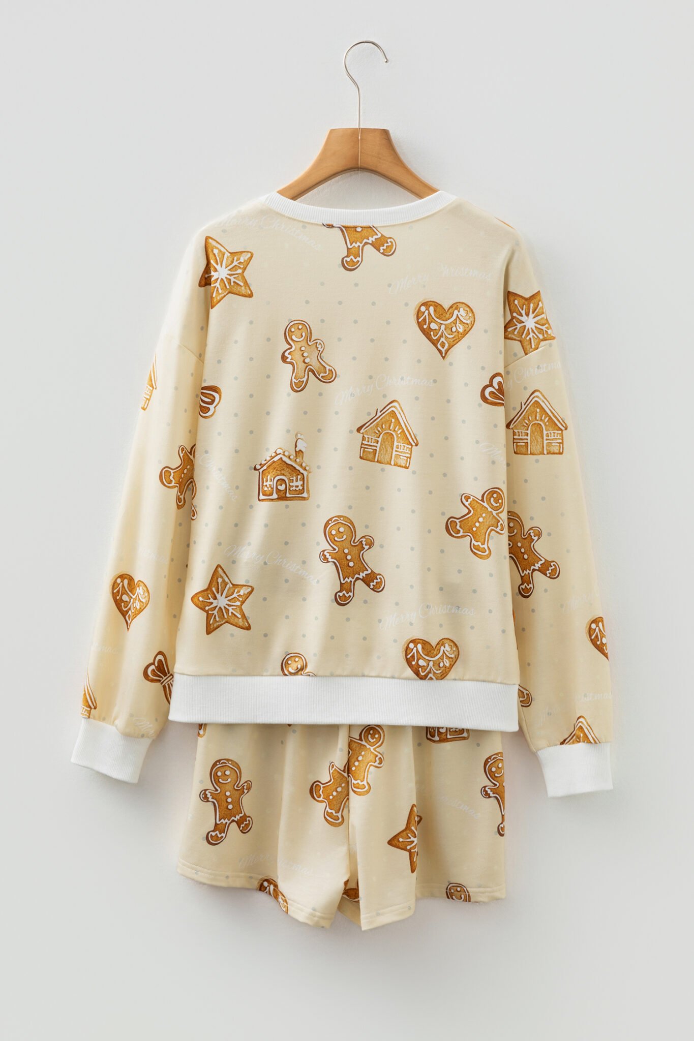 Beige Gingerbread Man Christmas Print Long Sleeve Pullover Lounge Short Set