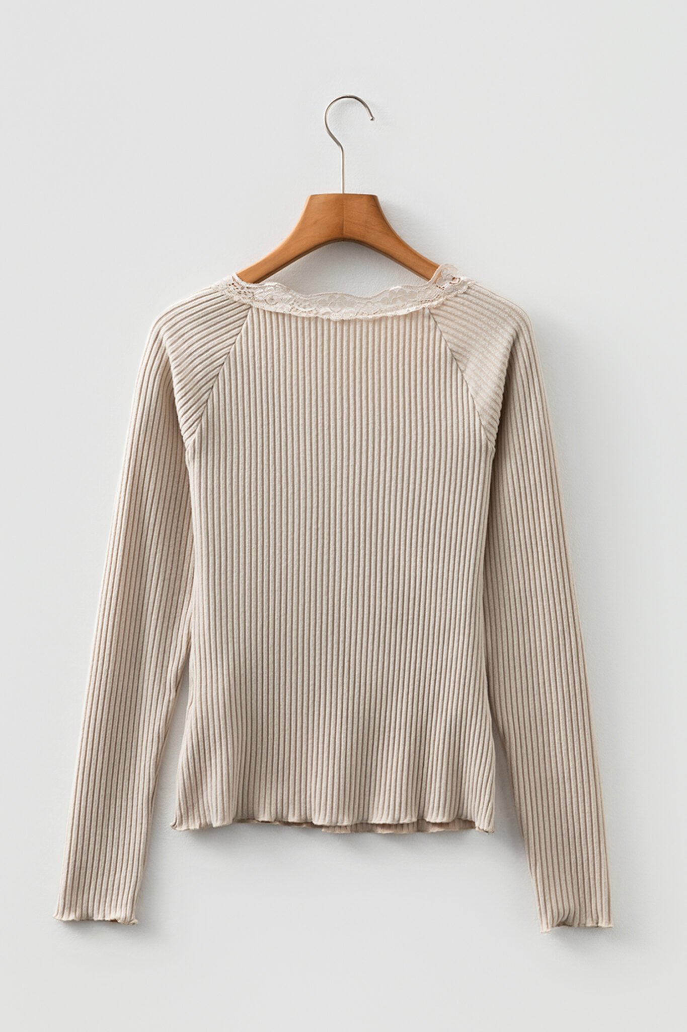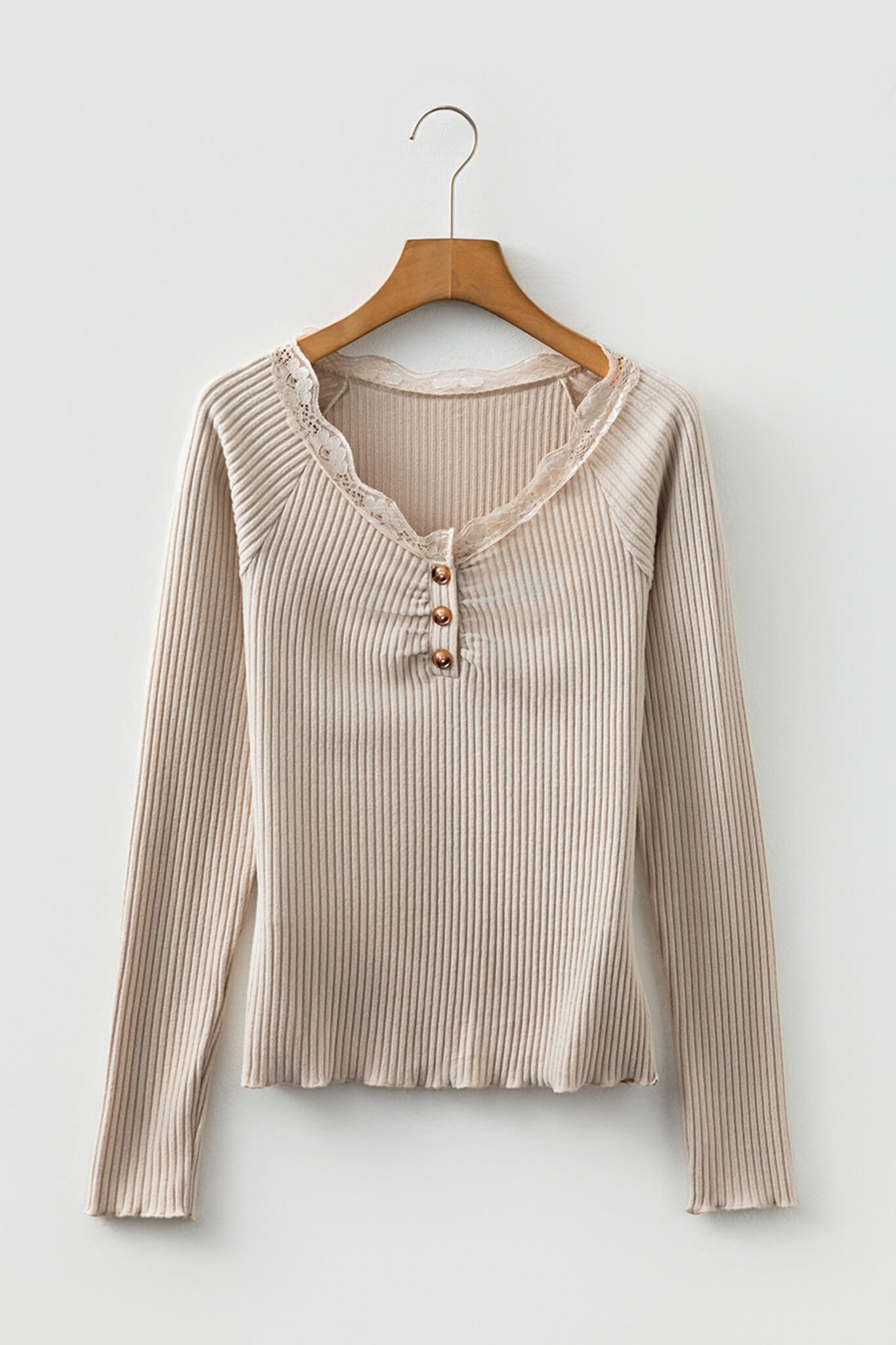 Beige Lace Neckline Button Decor Lettuce Edge Long Sleeve Ribbed Top