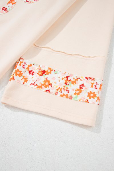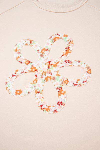 Beige Plus Size Flower Patched Side Slits Crewneck Top