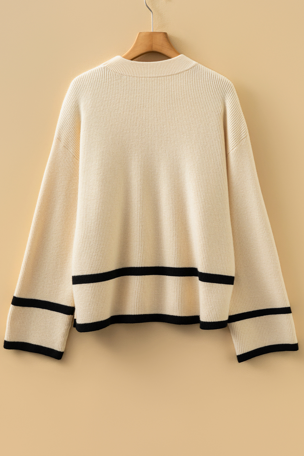 Beige Ribbed Knit Contrasted Stripe Detail Button Side Loose Sweater