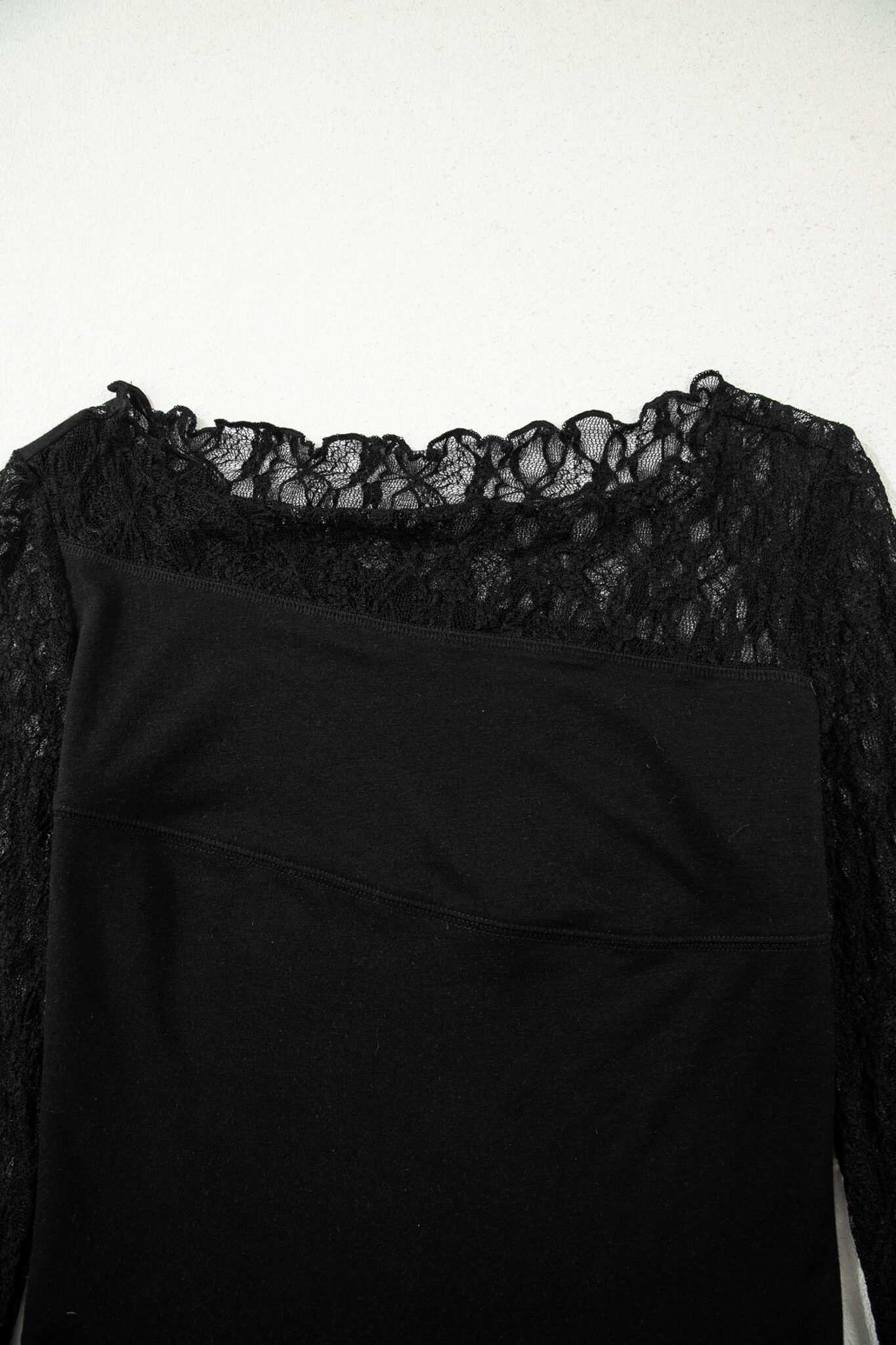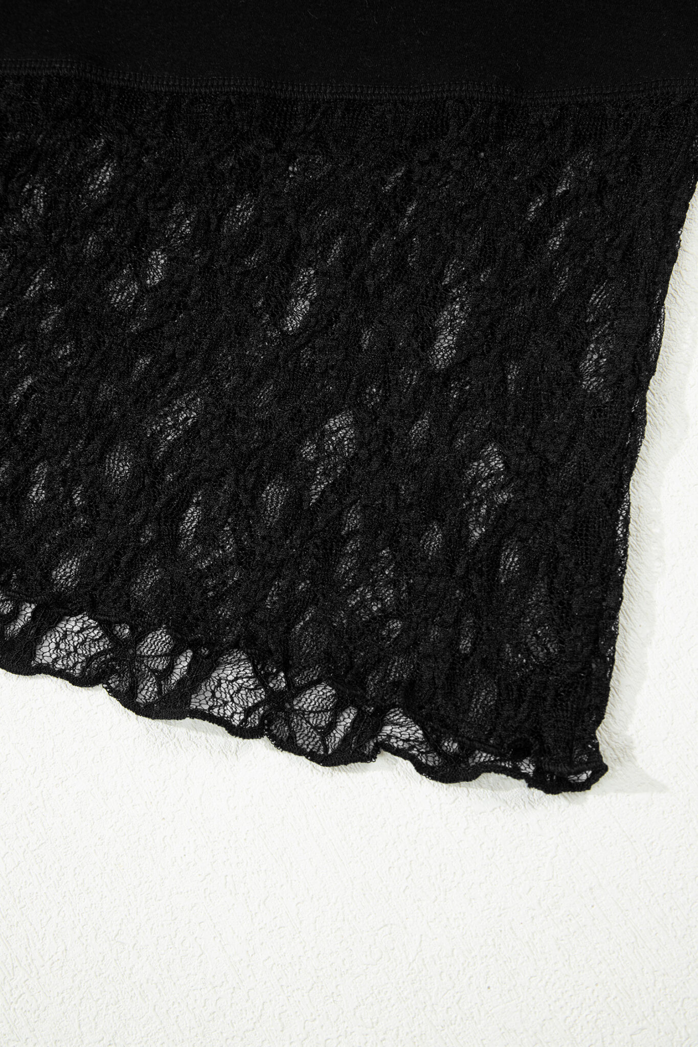 Black Asymmetric Panels Sheer Floral Lace Patchwork Long Sleeve Top