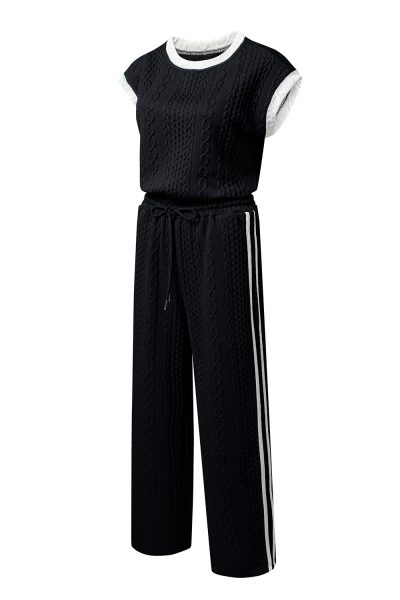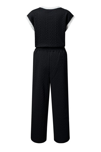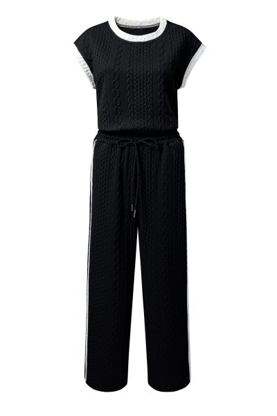 Black Cable Knit Contrast Trim Short Sleeve Top and Pants Set