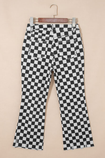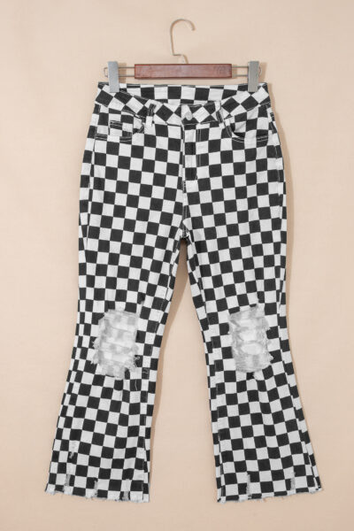 Black Checkerboard Print Distressed Holes Raw Edge Cropped Jeans