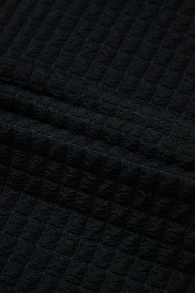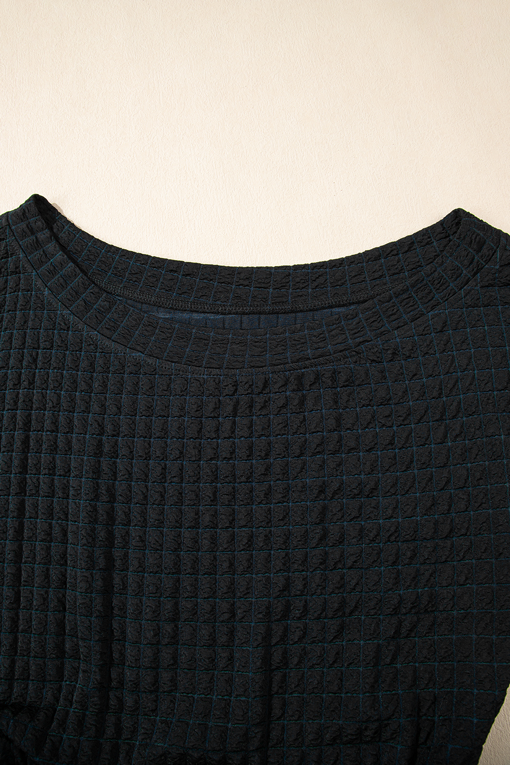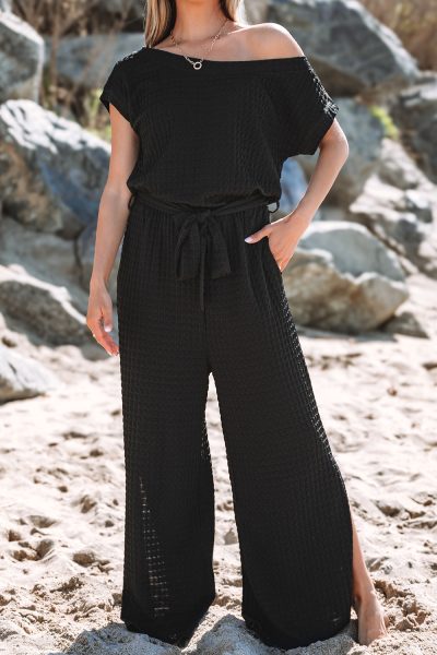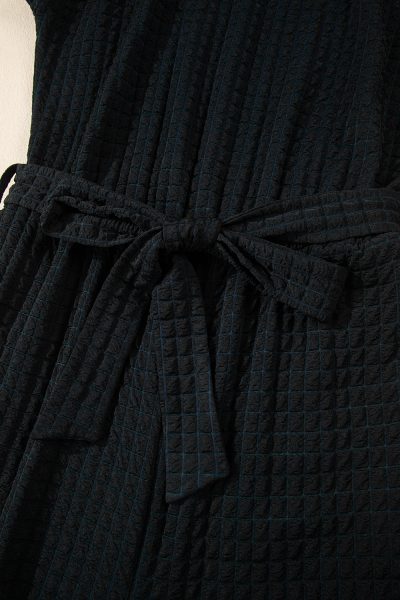Black Checkered Mesh One Shoulder Short Sleeve Knotted Waist Jumpsuit