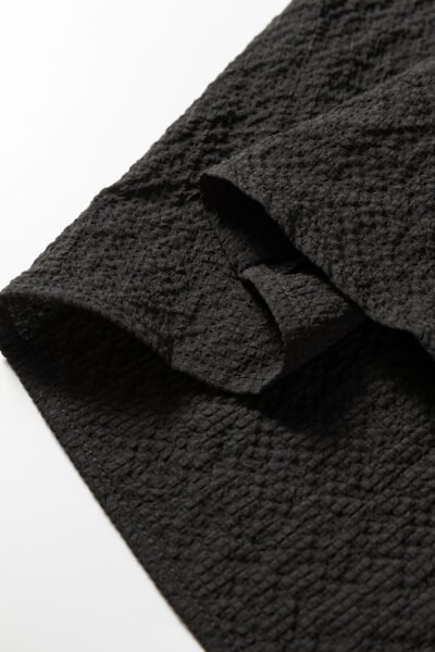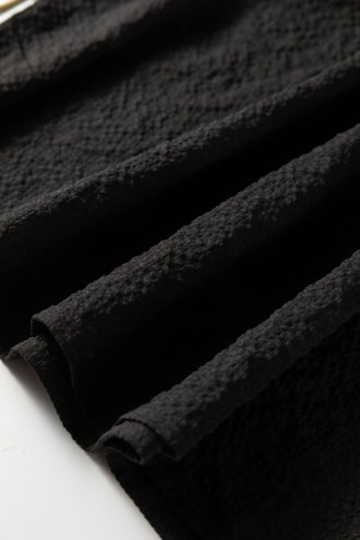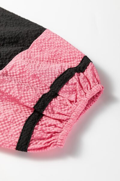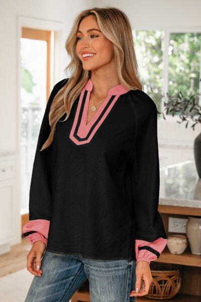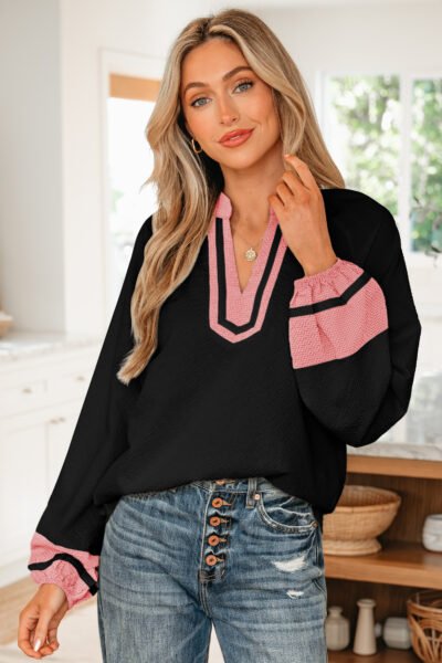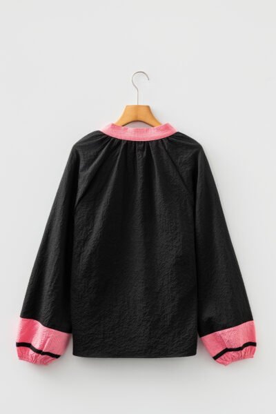 Black Color Block Patchwork Detail V Neck Textured Long Sleeve Blouse