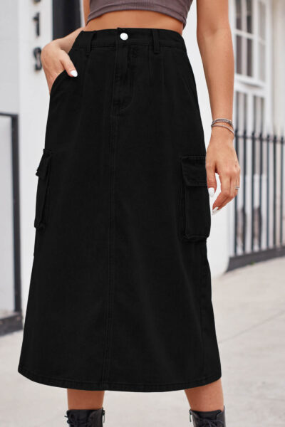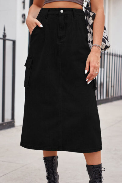 Black Color Casual Washed Denim Cargo Midi Skirt with Back Slit