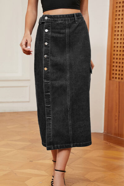 Black Color Washed Frayed Denim Midi A Line Maxi Skirt