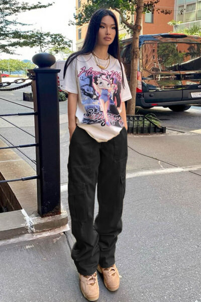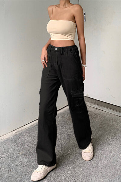 Black Denim Cargo Pants with Elastic Waist Design