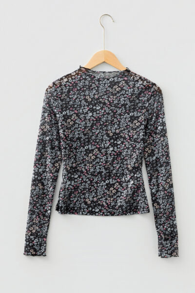 Black Ditsy Floral Mesh Thumbhole Sleeve Slim Fit Top