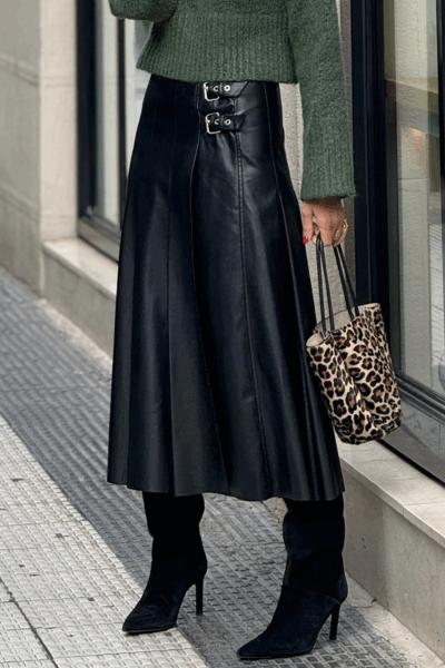 Black Faux Leather Retro Buckle Detail Pleated Stitch Flared Midi Skirt