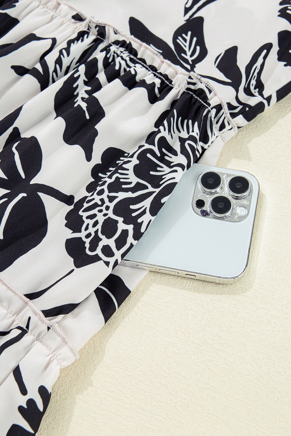 Black Floral Print Tiered Frilled Half Sleeve Plus Size Mini Dress