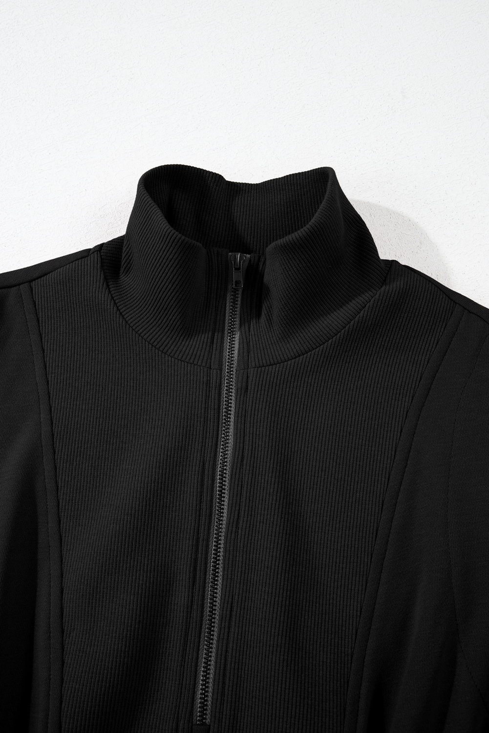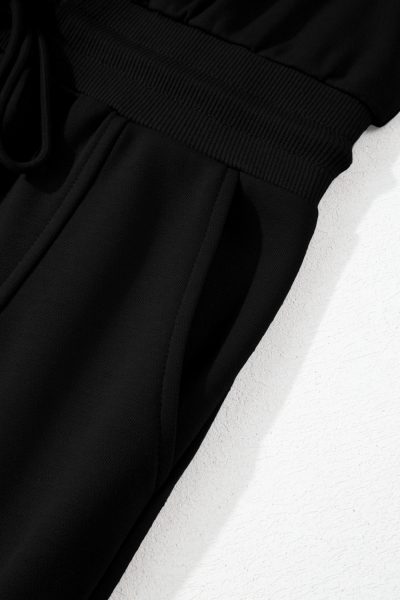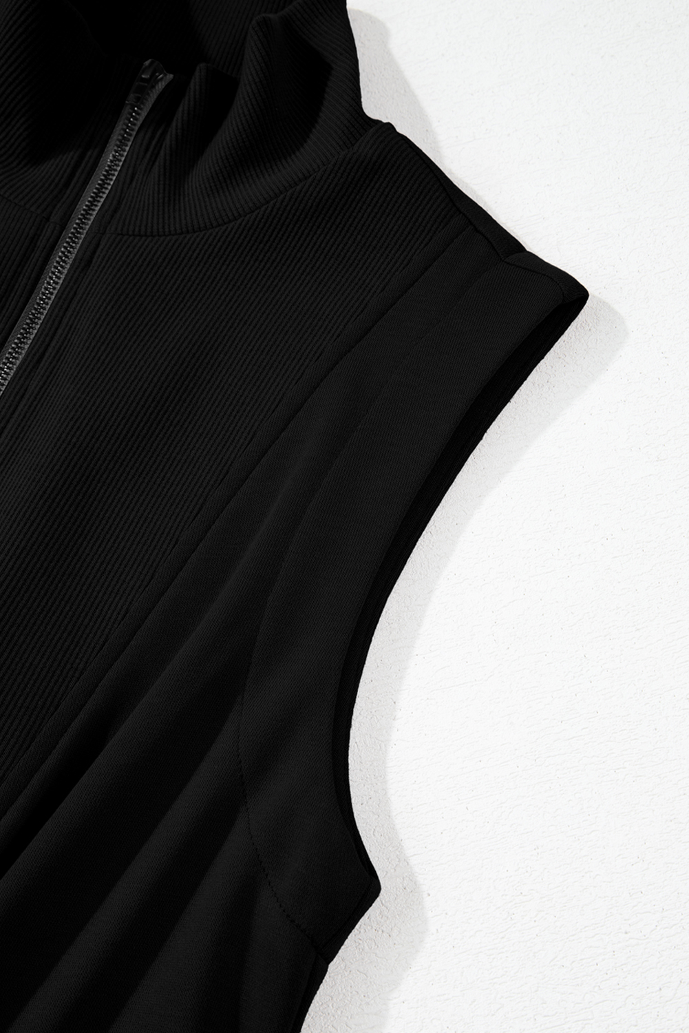 Black French Terry Zipped Collar Sleeveless Drawstring Waist Mini Dress