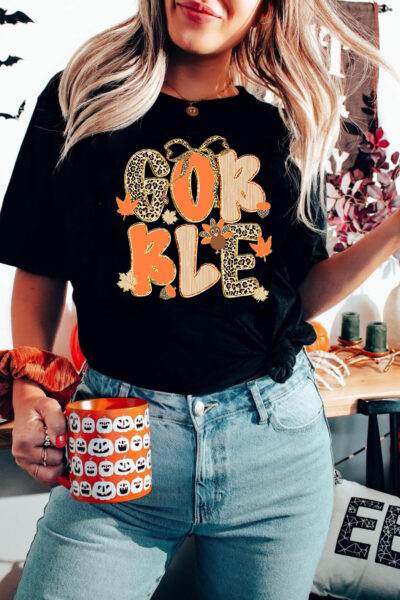 Black GOBBLE Leopard Letter Print Turkey Bow Graphic T Shirt