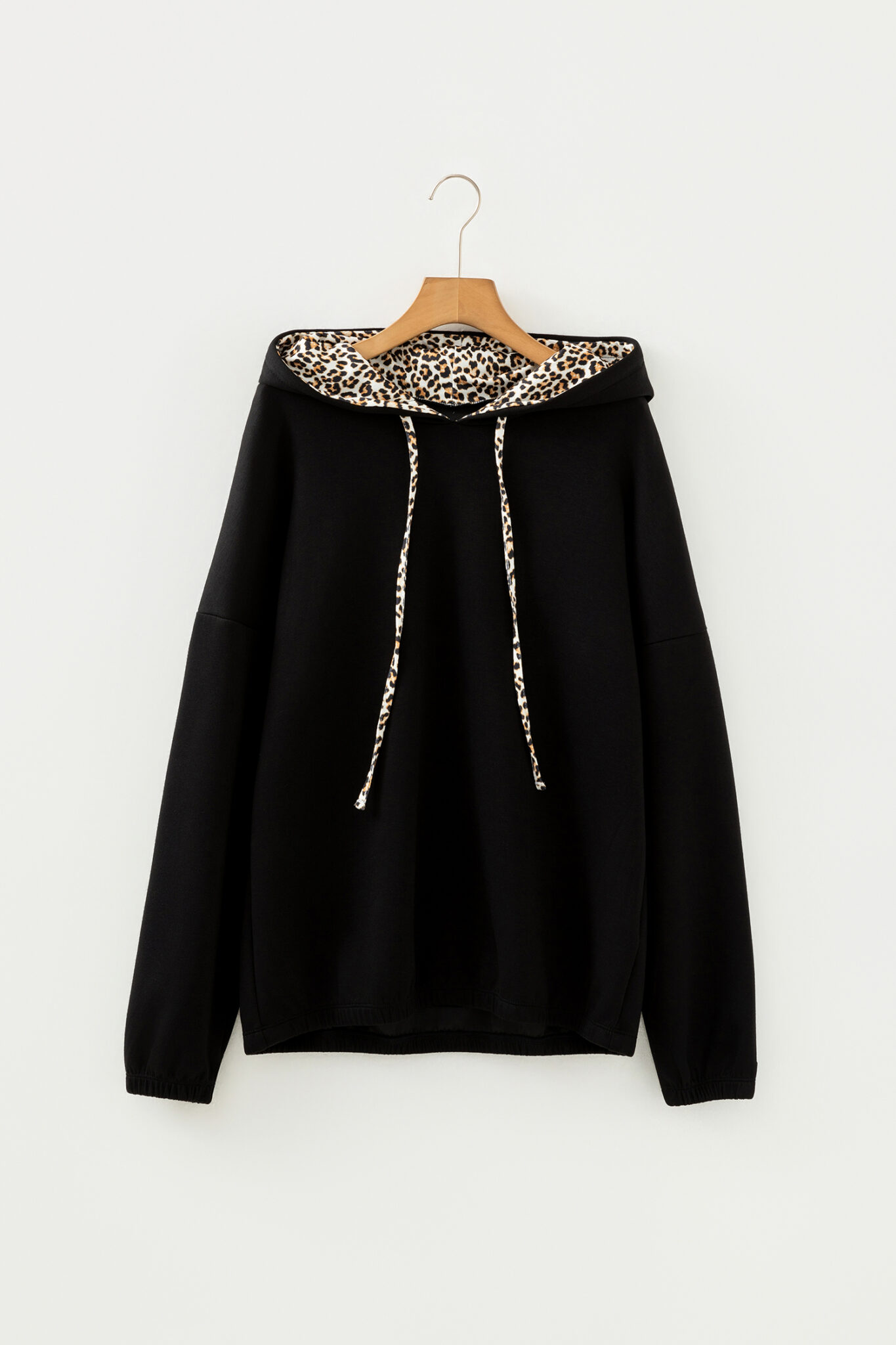 Black Leopard Contrast Drawstring Hood Drop Shoulder Loose Top
