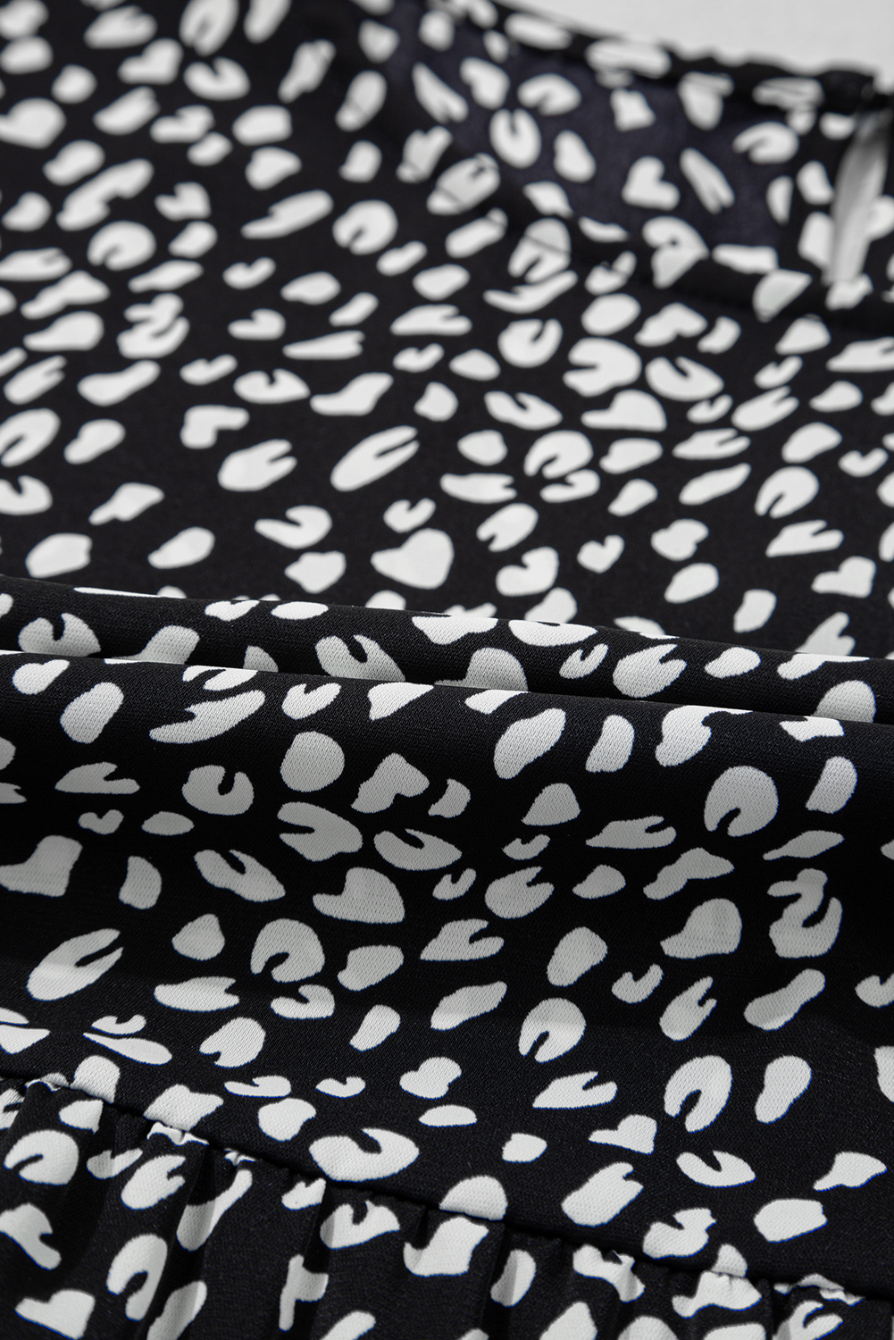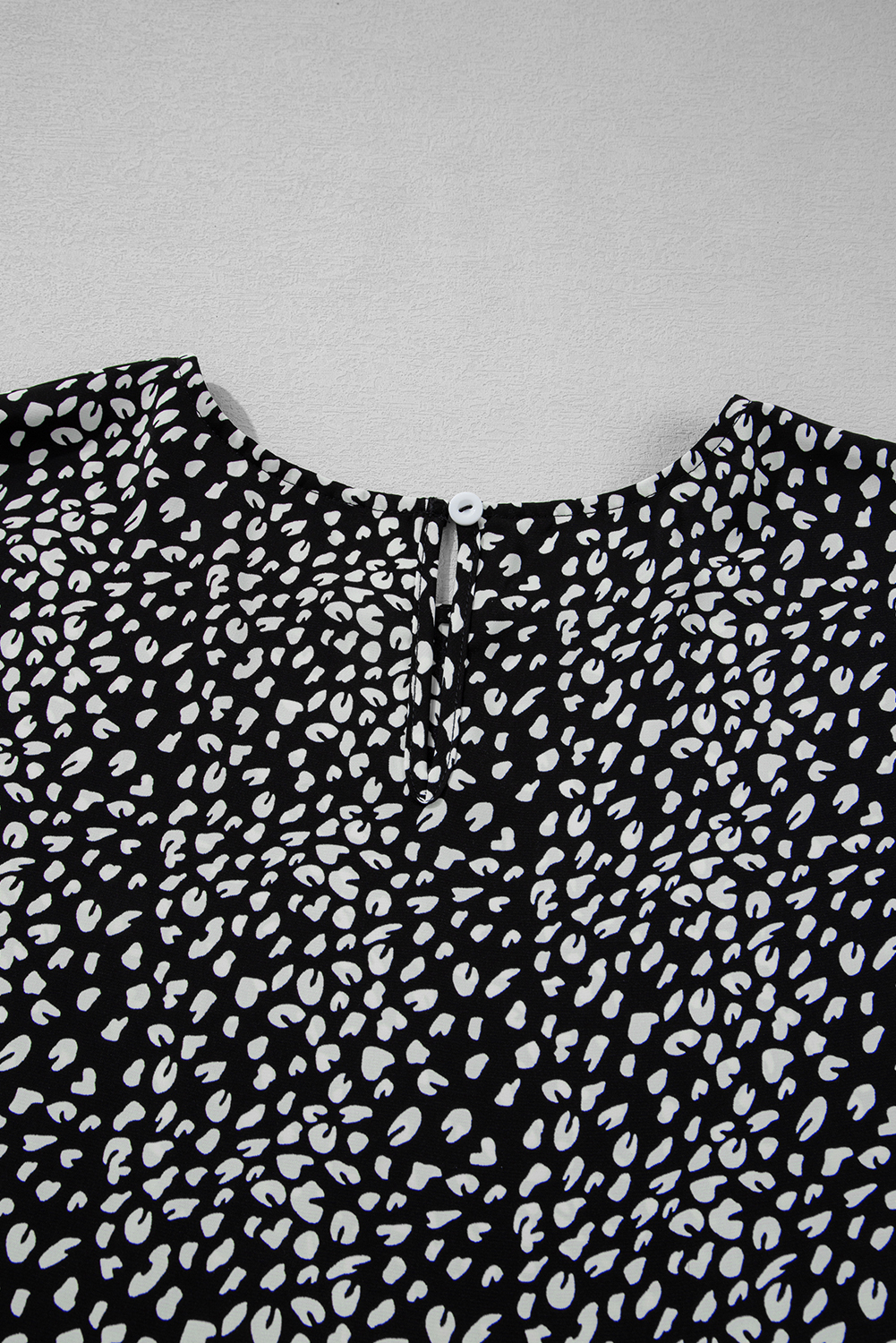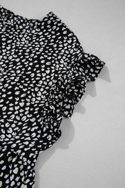 Black Leopard Print Ruffled Short Sleeve Keyhole Back Tiered Flowy Plus Size Blouse