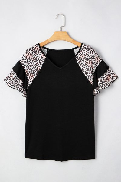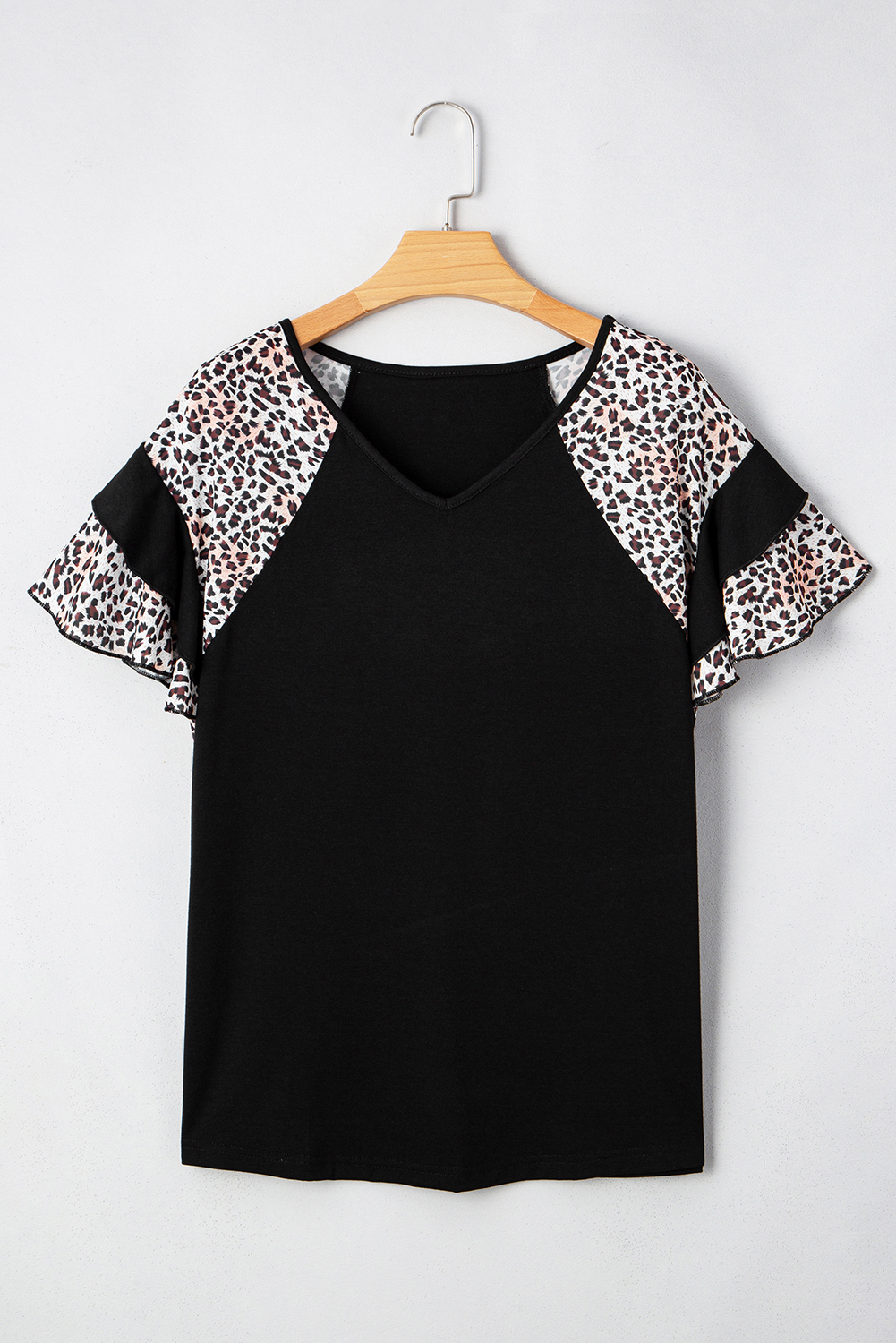 Black Leopard Ruffle Patchwork Sleeve Plus Size Summer Top