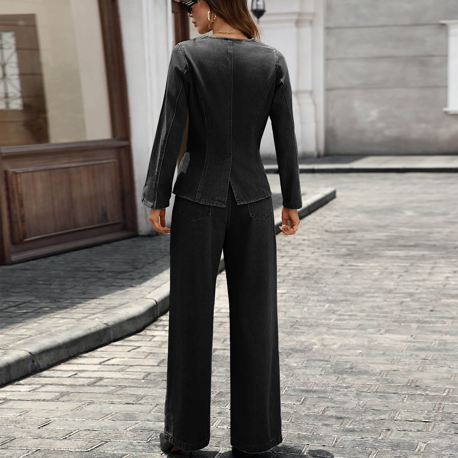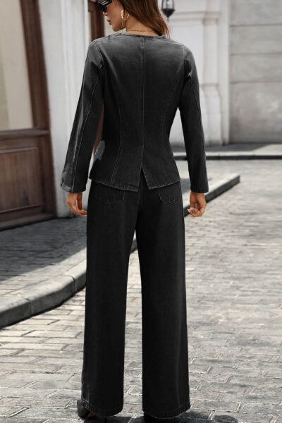 Black New-In Washed Denim Long Sleeve Top & Pants Set