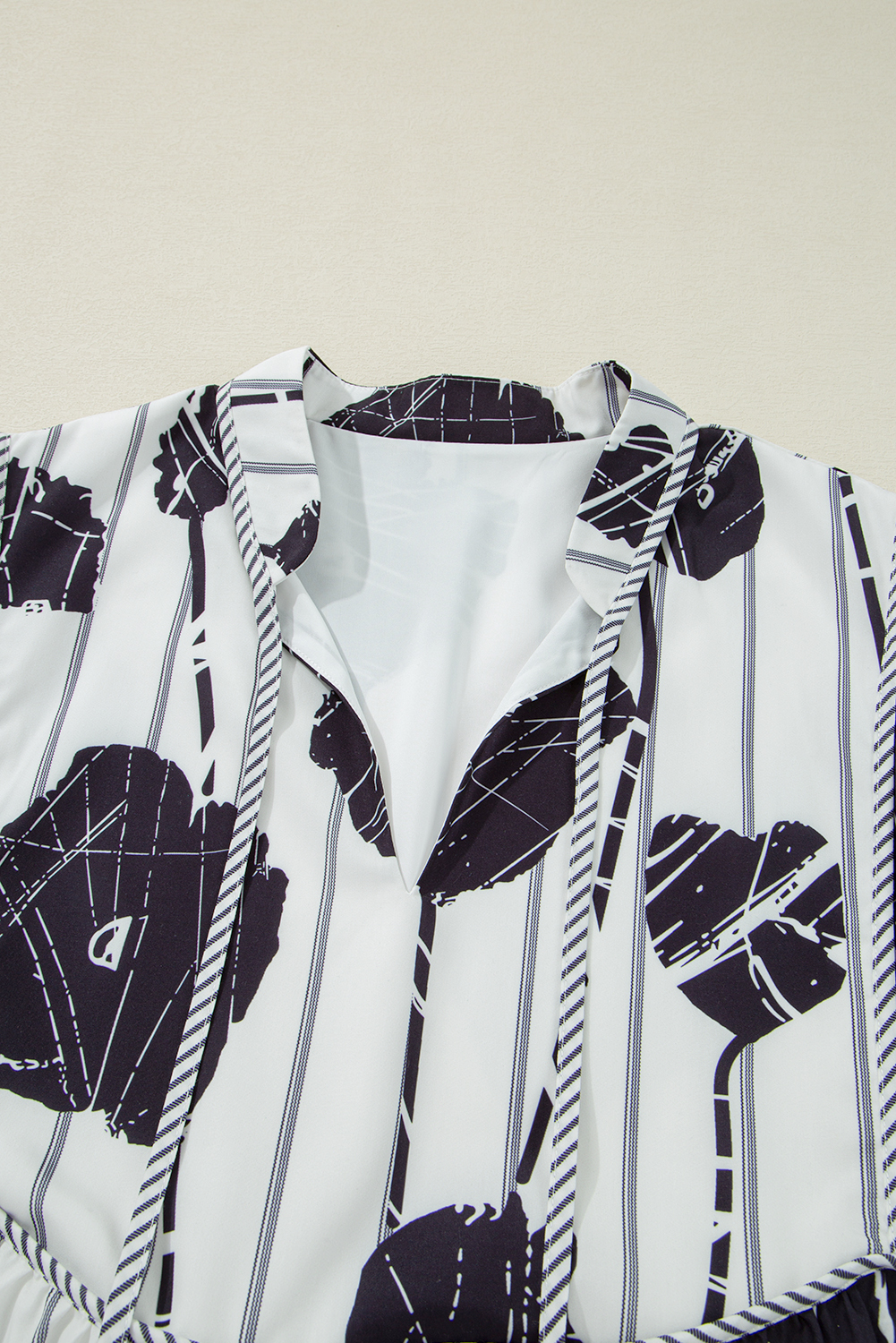 Black Plus Size Floral 3/4 Puff Sleeve Lace-up Neck Mini Dress