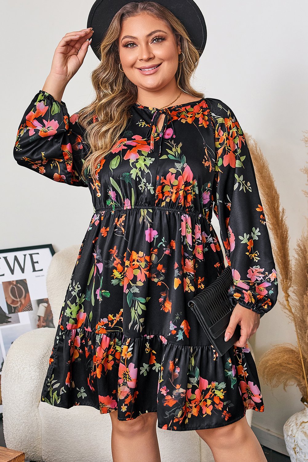 Black Plus Size Floral Print Tie Neck Cinched Waist Long Sleeve Mini Dress