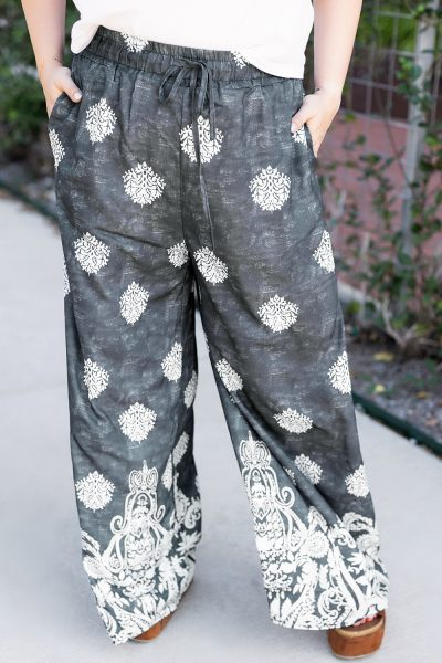 Black Plus Size Geometric Ethnic Print Drawstring Wide Leg Pants
