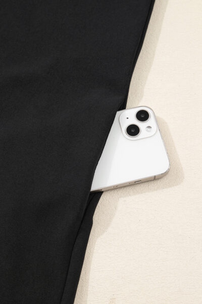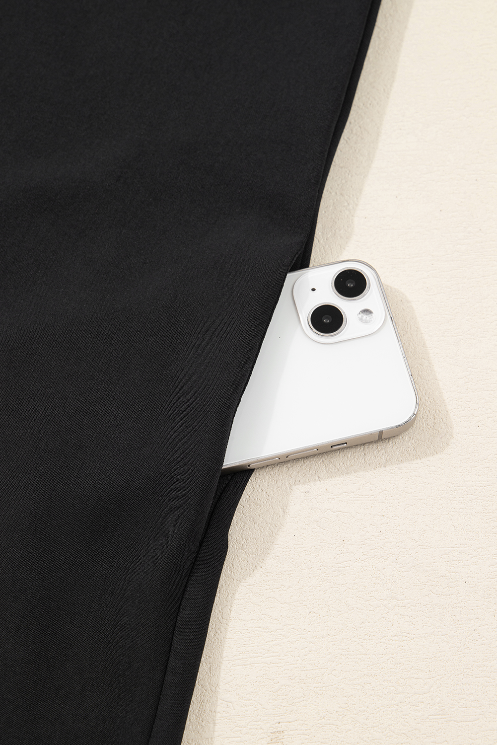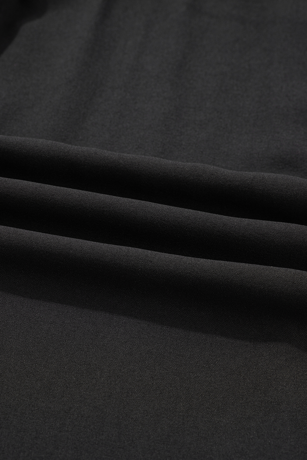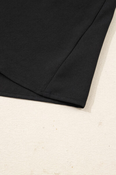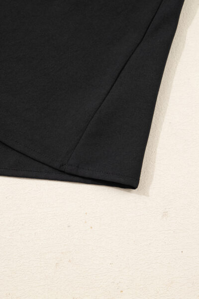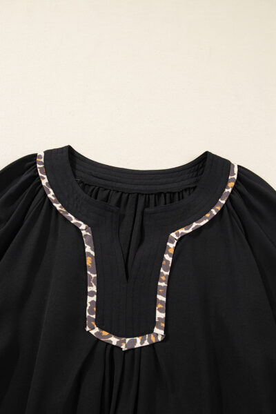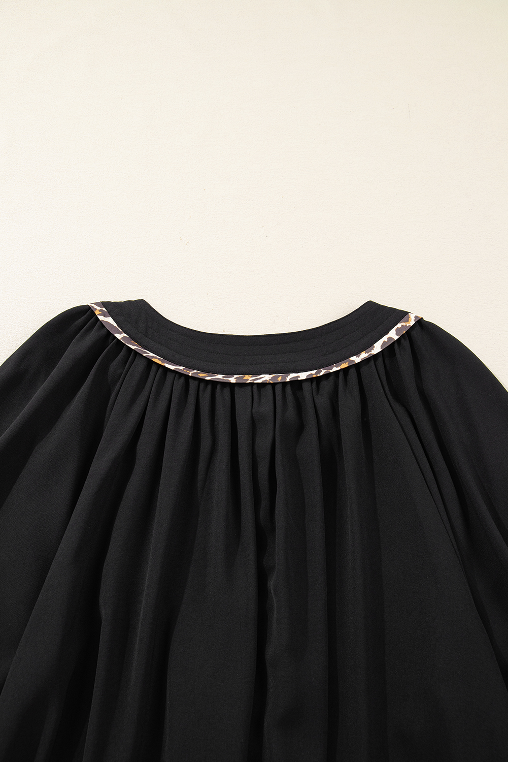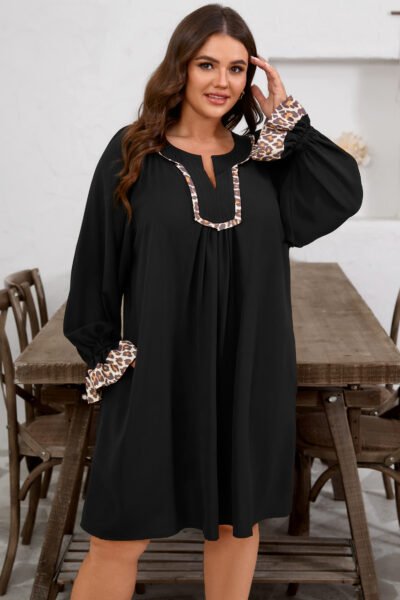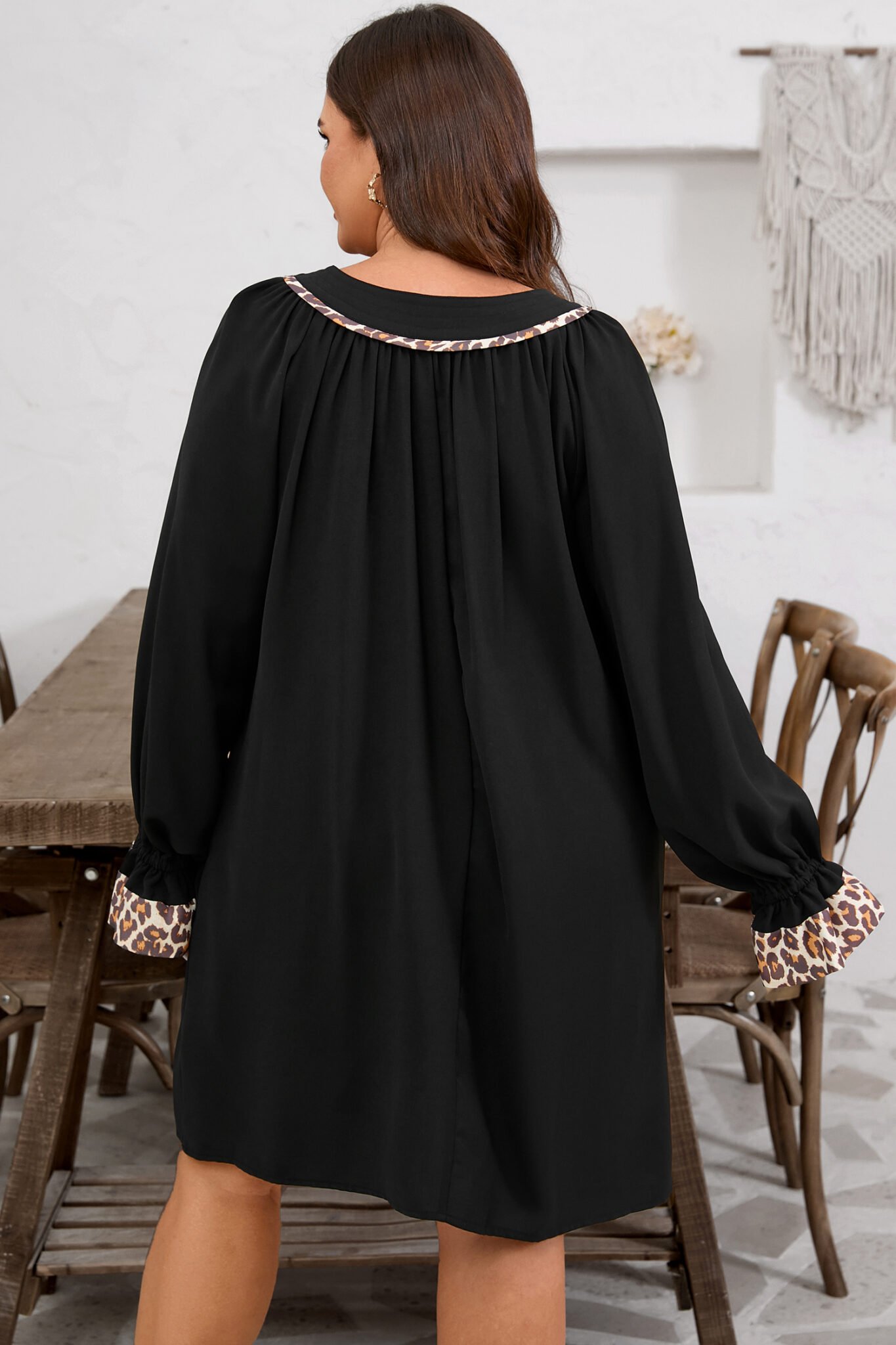 Black Plus Size Notched Neck Leopard Trim Flounce Long Sleeve Shift Dress
