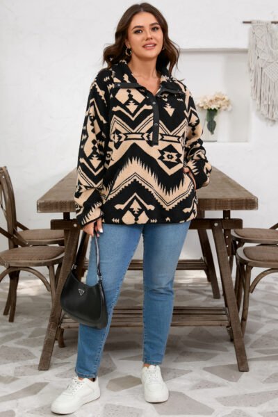 Black Plus Size Western Aztec Pattern Half Button Collared Plush Sweatshirt