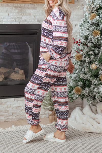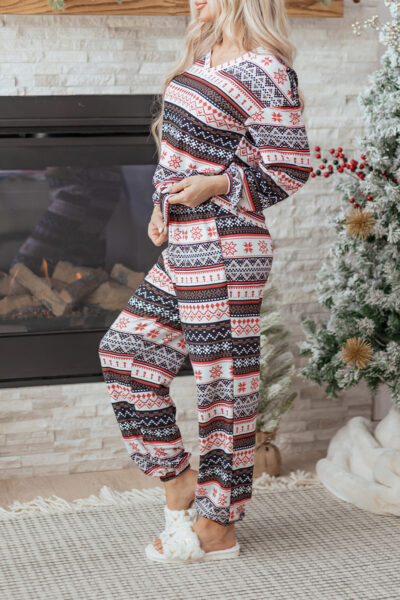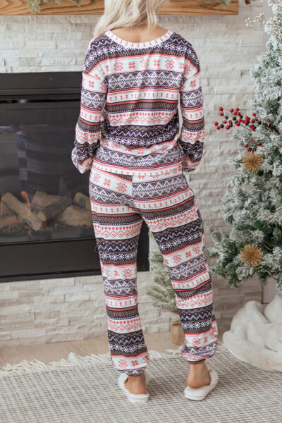 Black Retro Christmas Pattern Loose Pullover 2pcs Lounge Pant Set