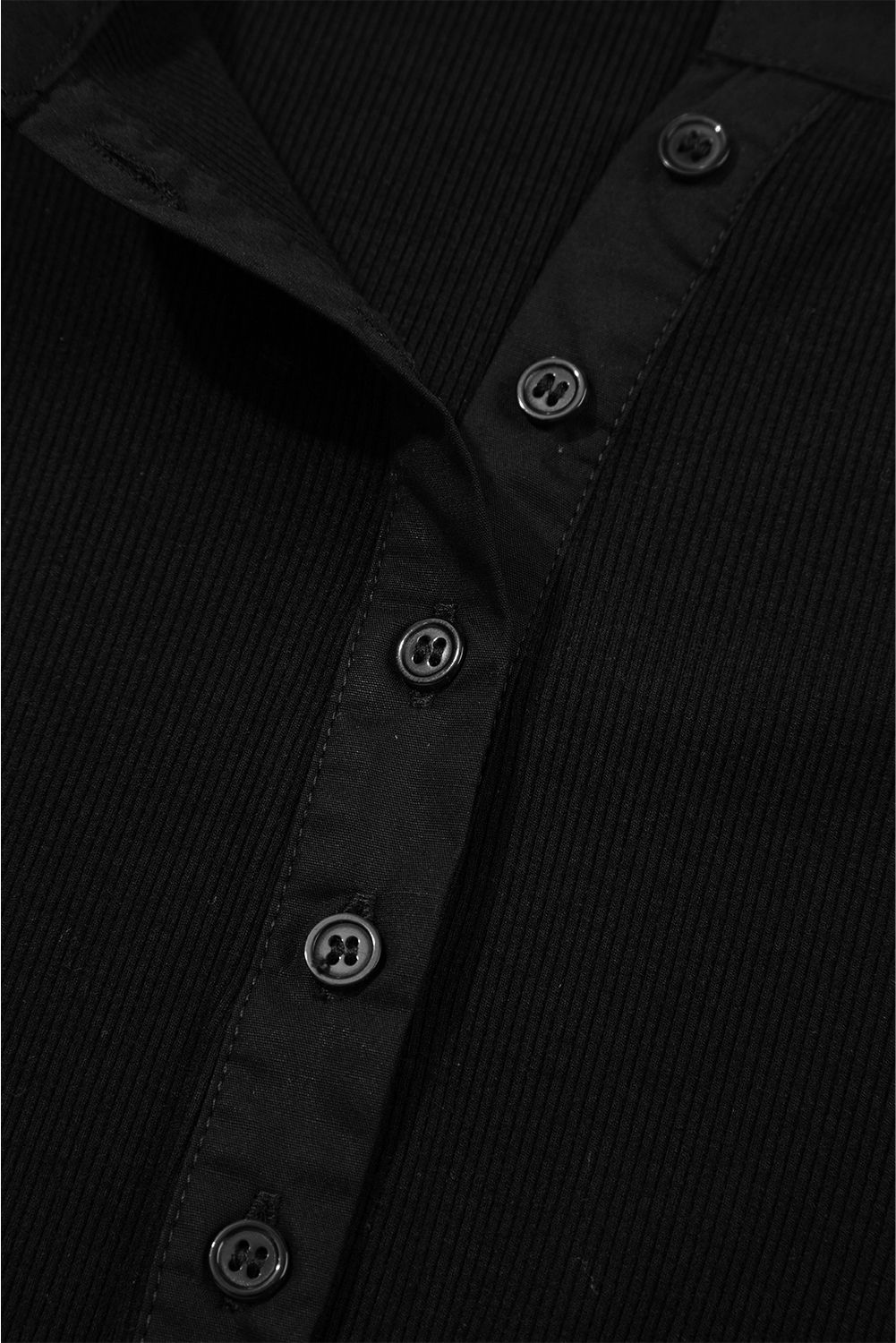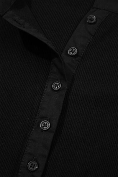 Black Ribbed Patchwork Puff Sleeve Half Button Placket Slim Fit Top