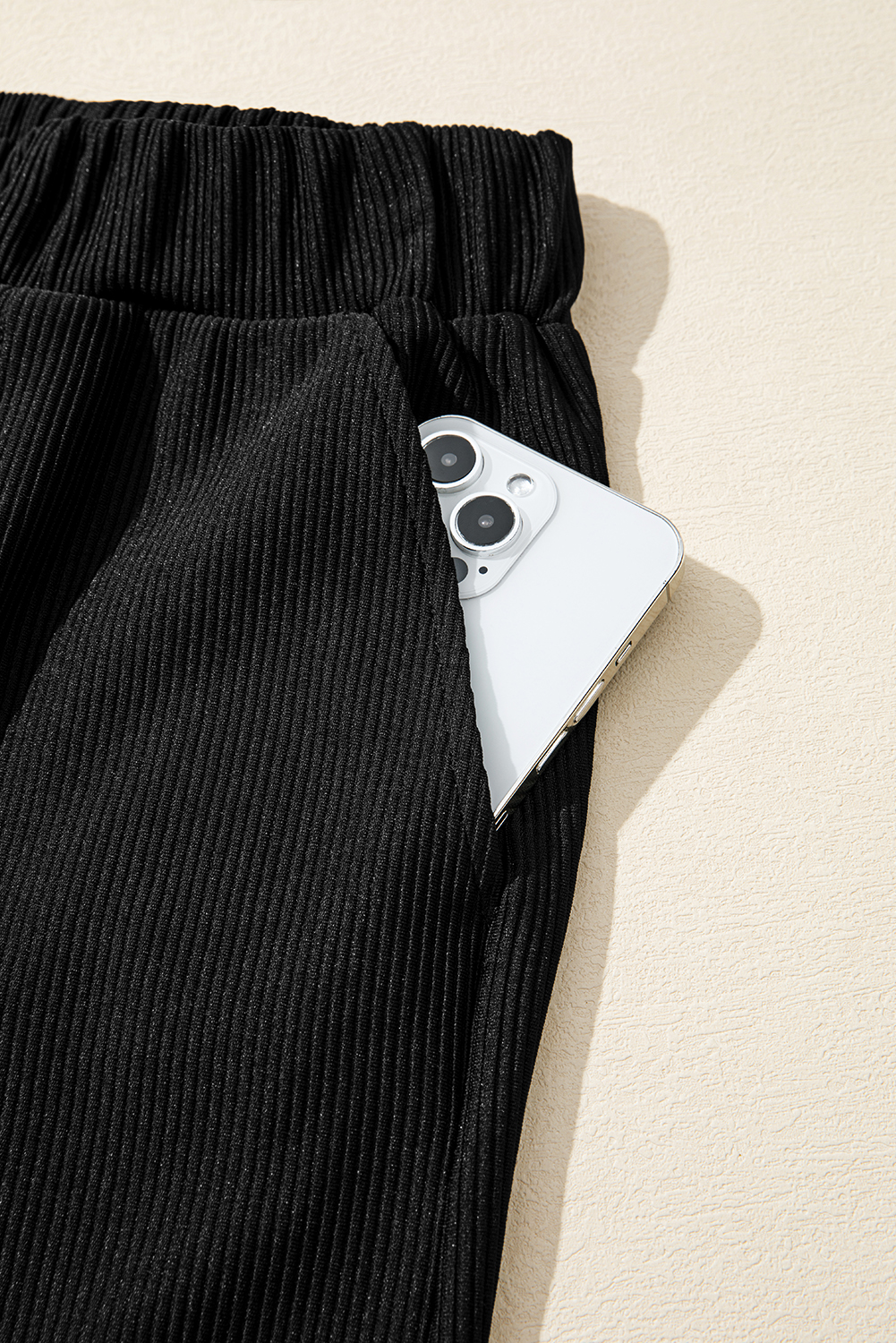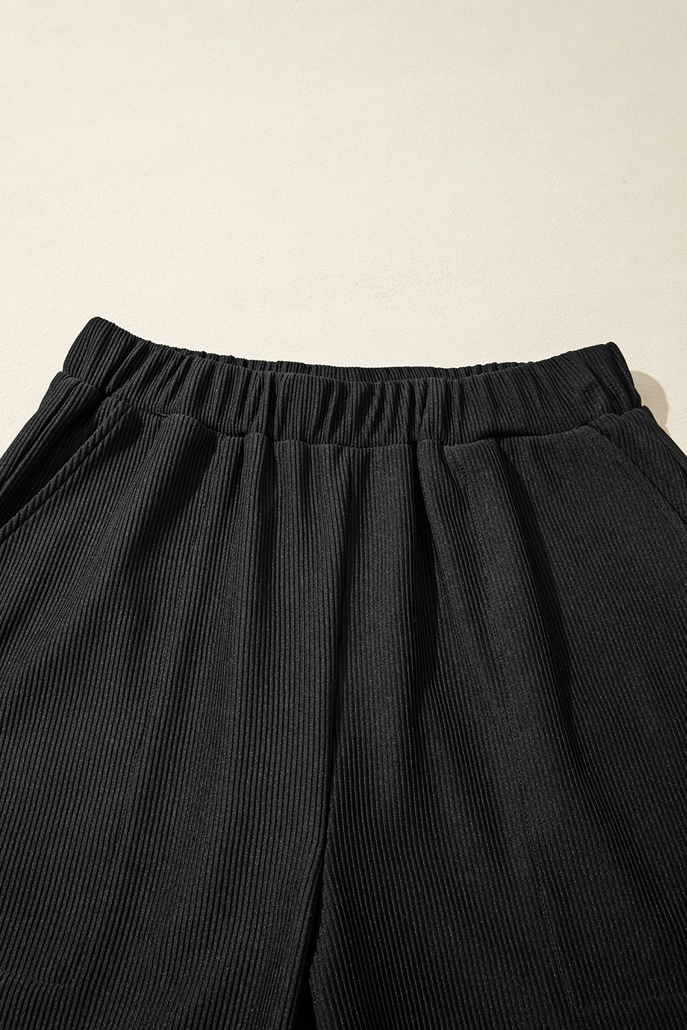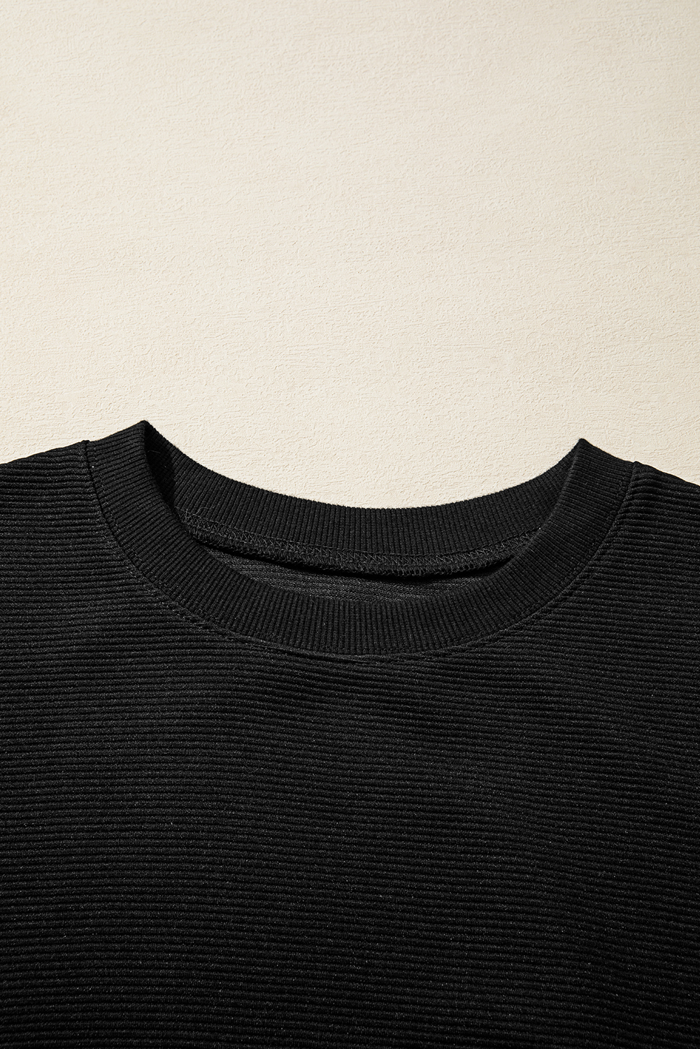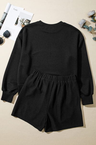 Black Ribbed Texture Baggy Drop Shoulder Pullover and Shorts Set