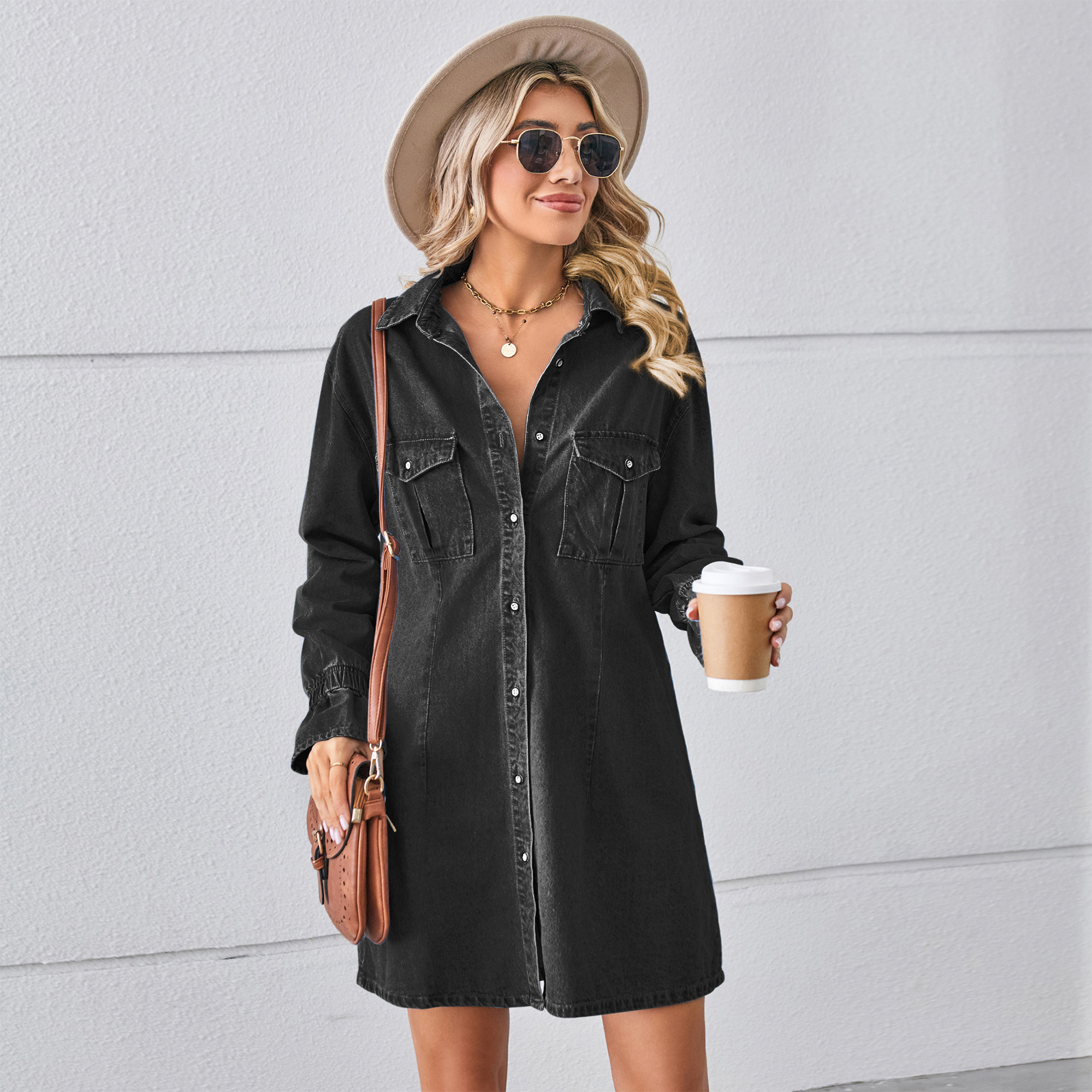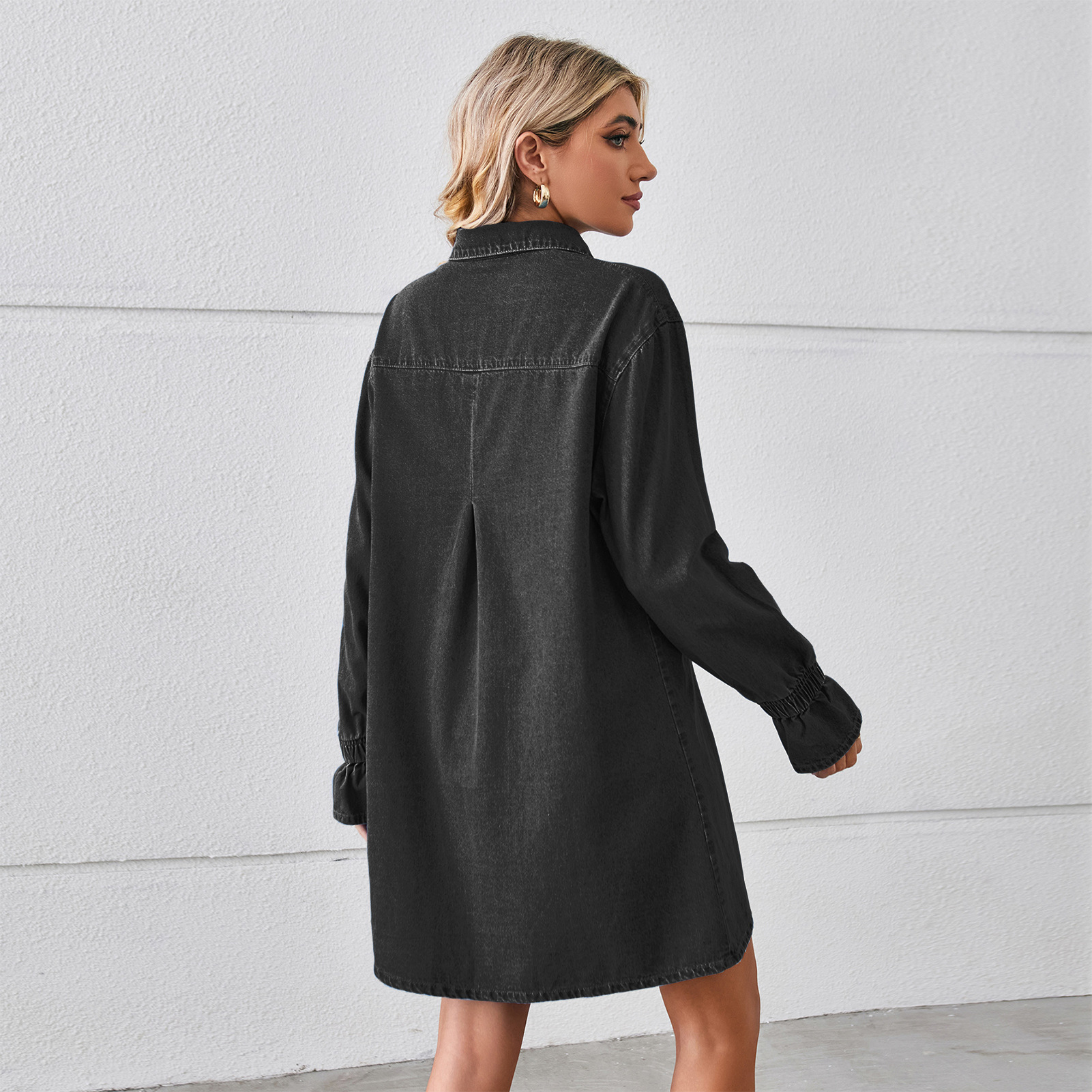 Black Smocked Cuffs Denim Shirt Mini Dress