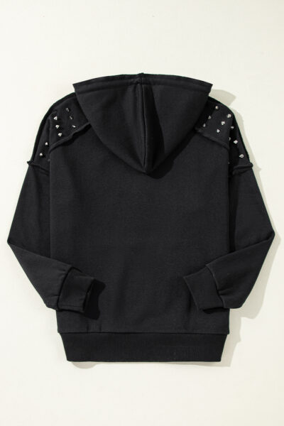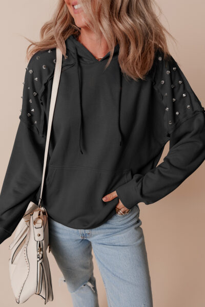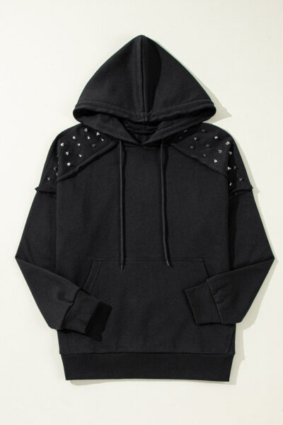 Black Solid Color Rivet Stud Raglan Sleeve Hoodie with Pocket
