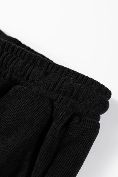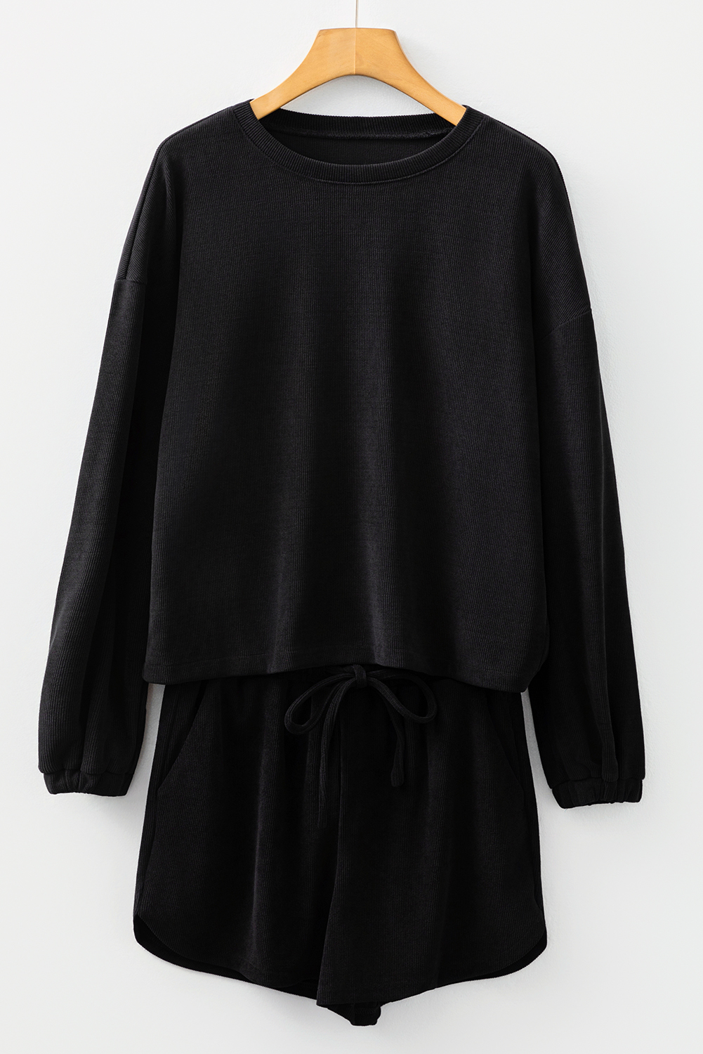 Black Solid Color Textured Knit Drop Shoulder Pullover Drawstring Shorts Set