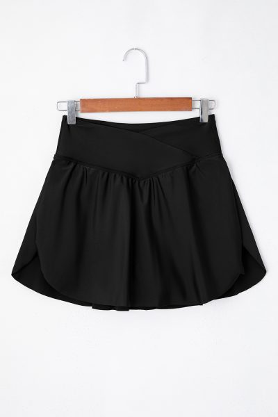 Black Solid Pocketed Crossover High Waist Swim Skort
