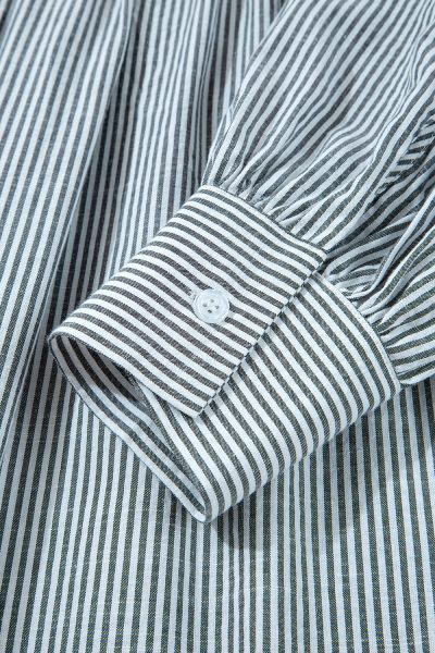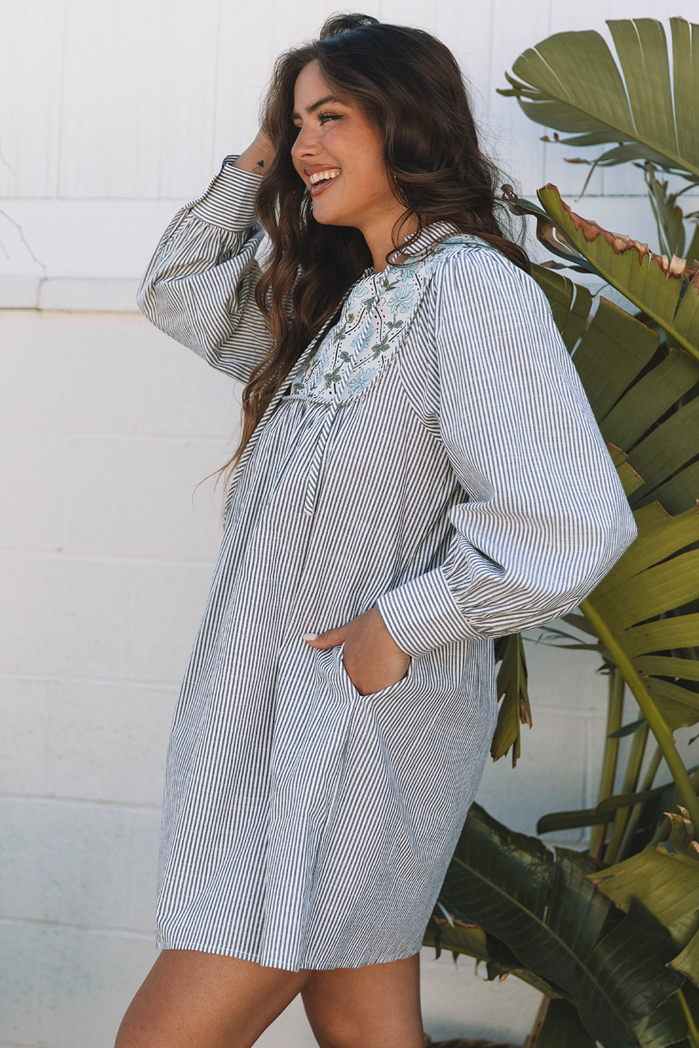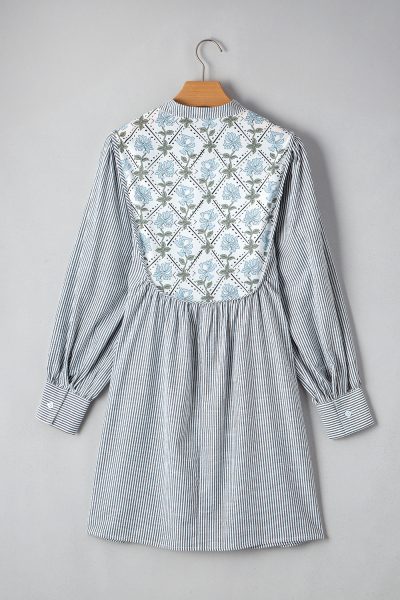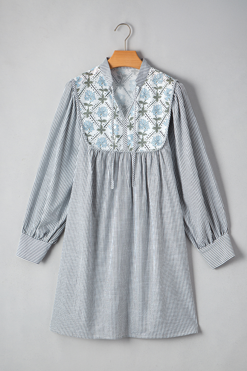 Black Stripe Floral Patchwork Tied V Neck Shift Long Sleeve Mini Dress