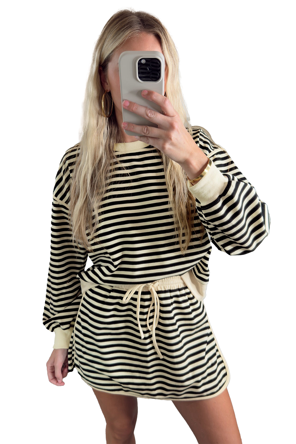 Black Stripe Textured Drop Shoulder Pullover Top Drawstring Mini Skirt Two Piece Dress Set