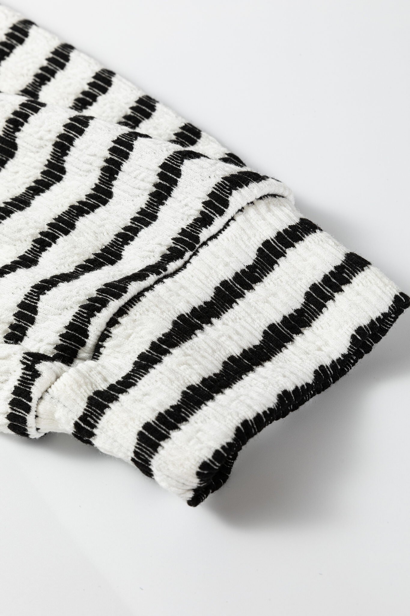 Black Stripe Textured Hooded V Neck Casual Long Sleeve Top