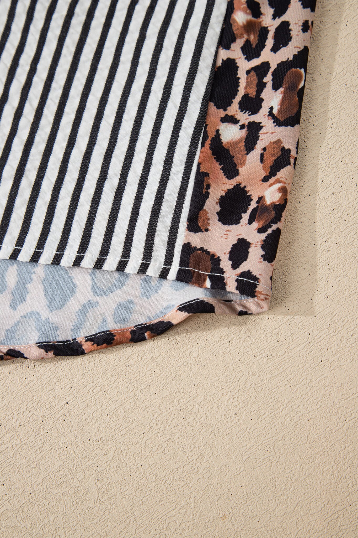 Black Striped Leopard Print Patchwork Button Up Womens Shirt