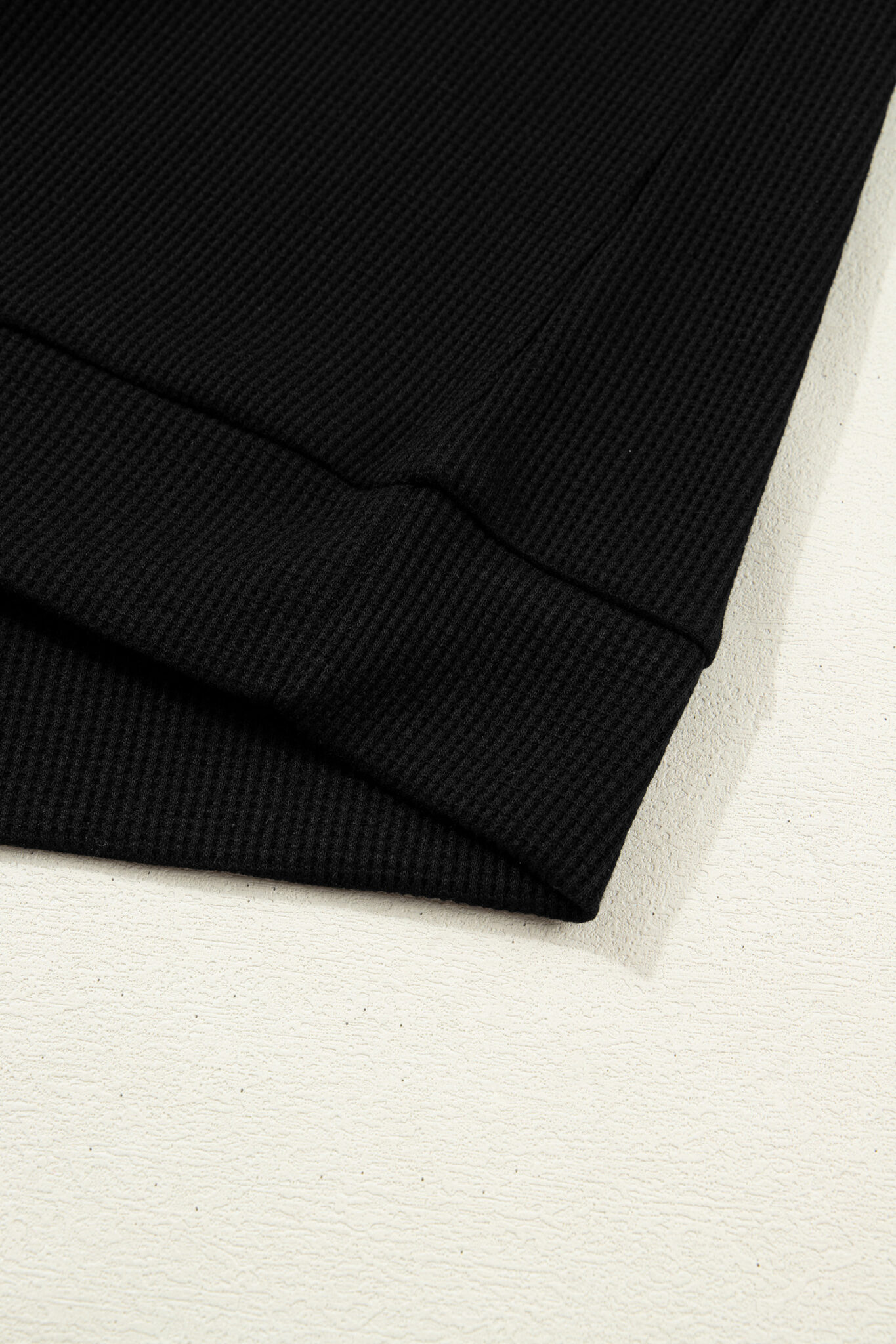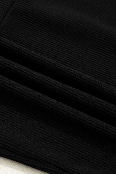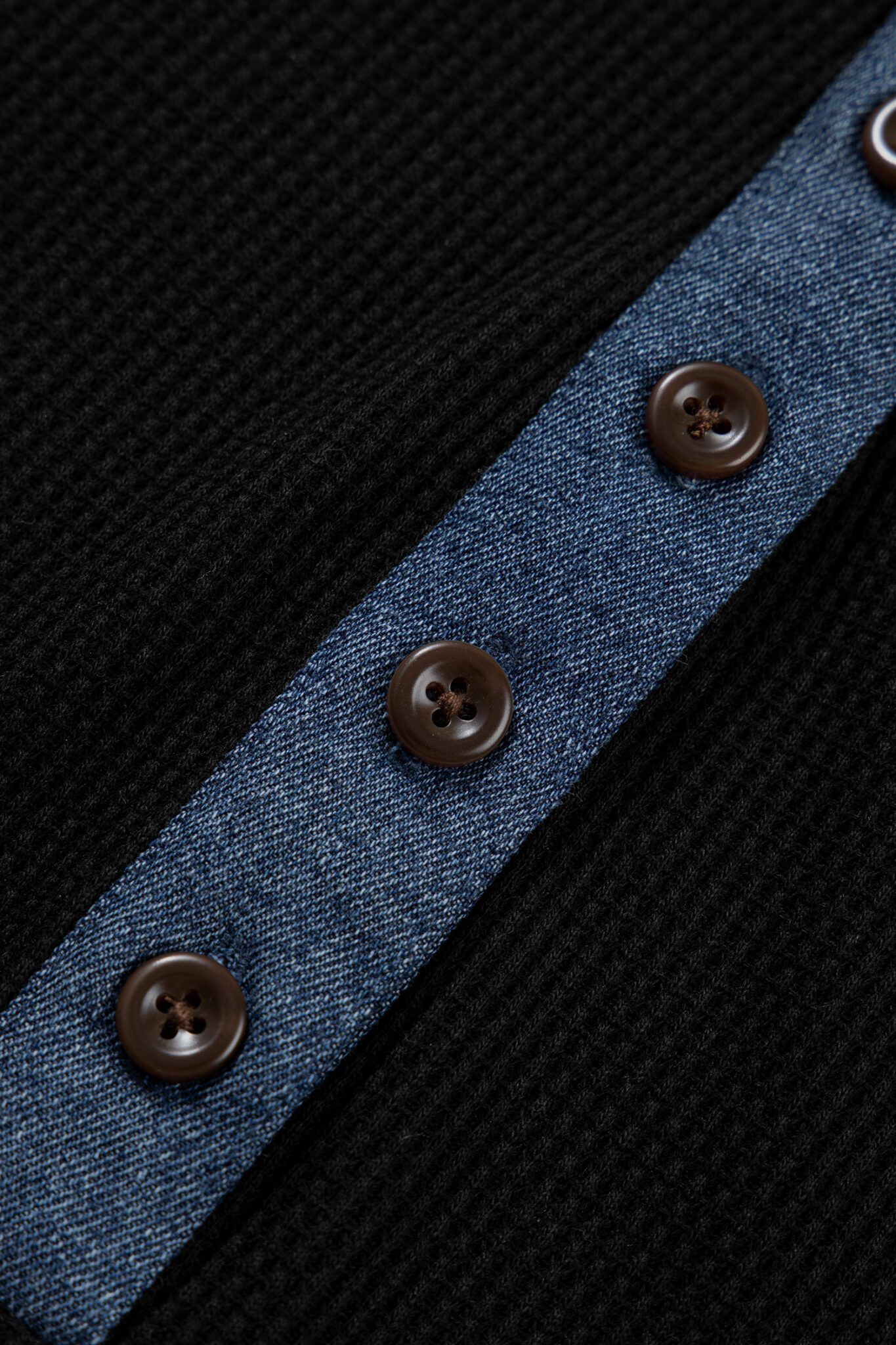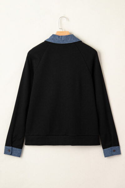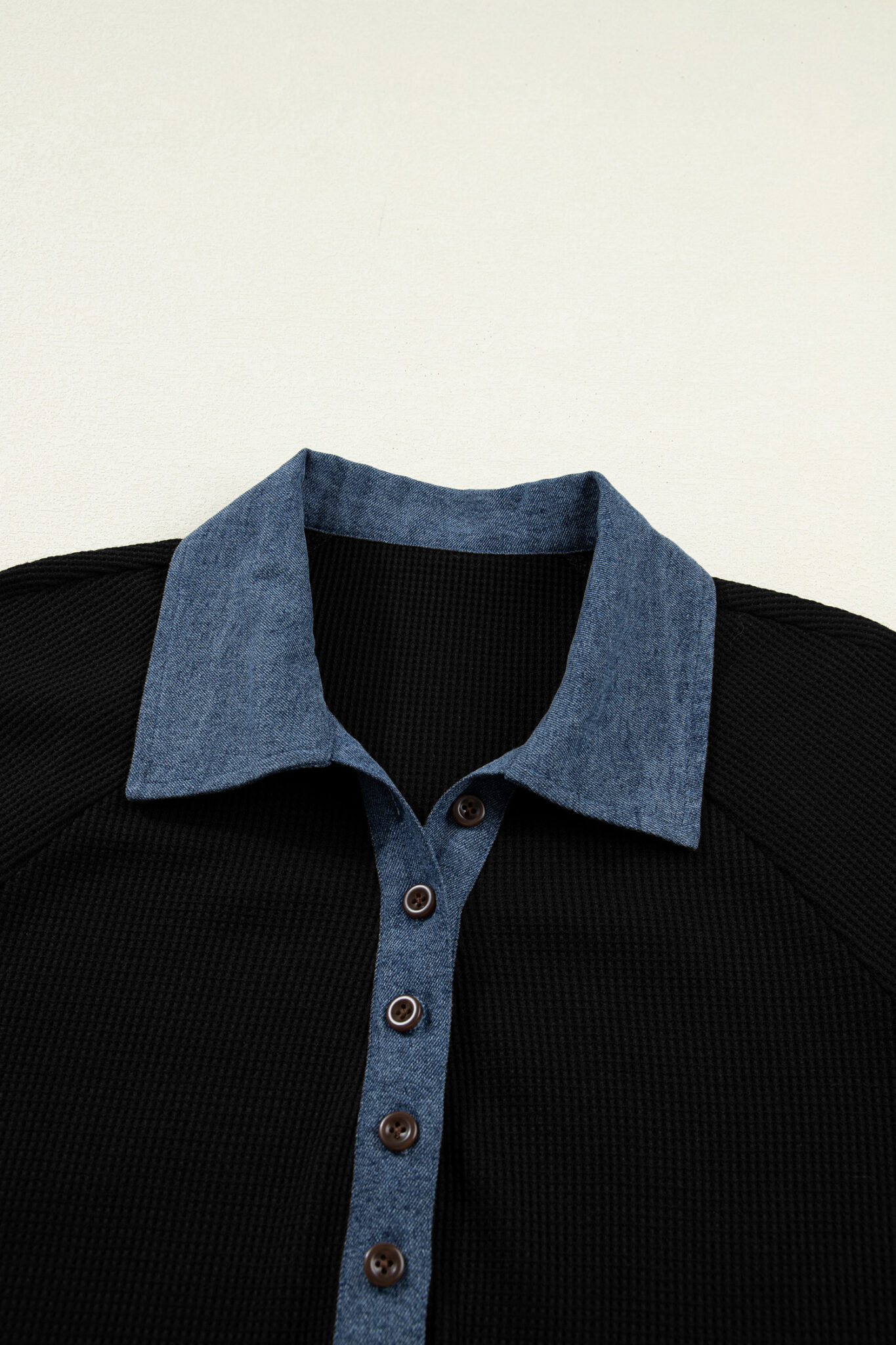 Black Textured Knit Denim Patchwork Button Polo Collar Long Sleeve Top