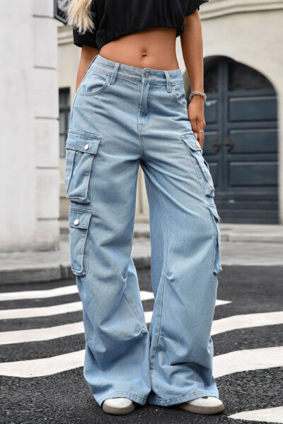 Black Utility Multi Pocket Straight Wide Leg Denim Cargo Pant