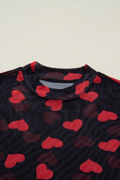 Black Valentines Heart Printed Sheer Mesh Long Sleeve Top